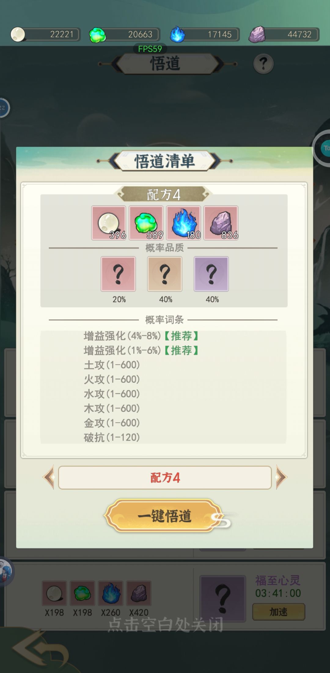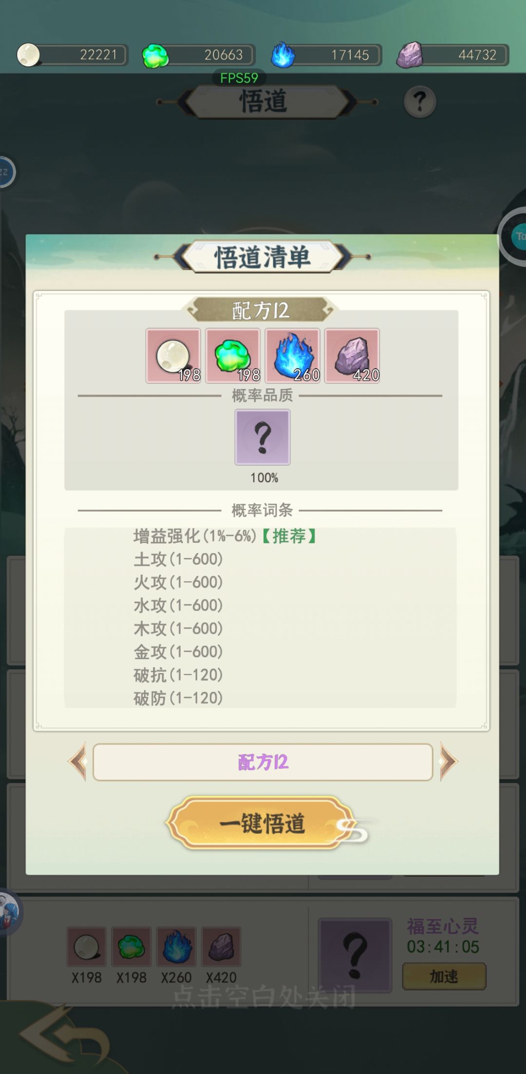 悟道(神通):相当于原神圣遗物的存在,是灵界重要的战力组成部分,神通获得的方式为2种,战令给稳定的一条8增益红神通但是其他词条有多有少,还有就是悟道通过消耗材料与时间获得,悟道材料可以通过节日礼包200玉购买而且挺实惠的,所以不推荐游商预购,游商那点真的是鸡毛蒜皮,悟道方案不要乱选!!配方4和配方12,具体可以获得什么词条的神通请看图67,前面推荐刷配方4,当你觉得你的红神通差不多紫神通不行的时候切配方12。神通总共分4大槽,每个槽有灵感上限且只能装4个神通,红6橙5紫4,不难可以得出每个槽是2红2紫或者4橙,4橙不好搞,一般是2红2紫,前期没有好的紫就带3红。神通最重要的词条就是增益强化,再者就是速度,再次是其他属性,神通每强化5级随机升级一个词条,最好升级到增益强化。神通材料的建筑(风林火山)前期你就每个建筑点一级意思意思就行,徽记还是主拿来升级人界四建筑。