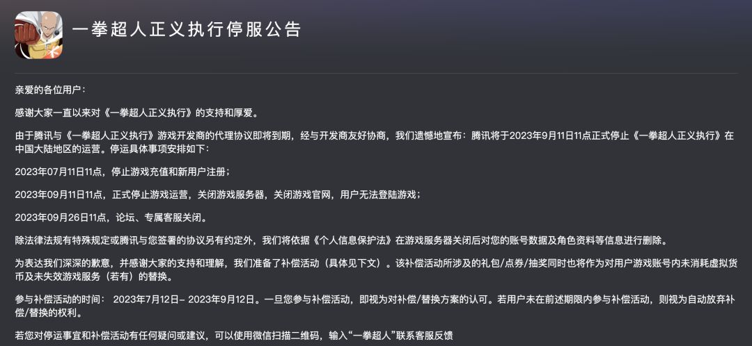 腾讯刚上一年的新游《一拳超人正义执行》正式停服了