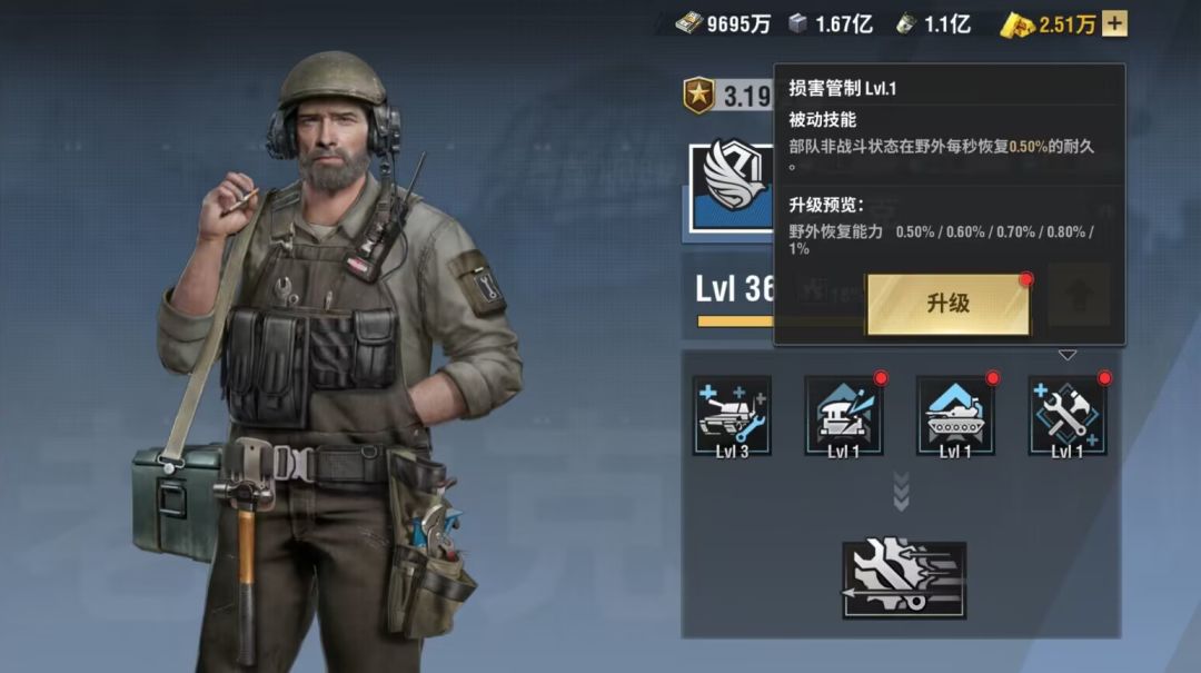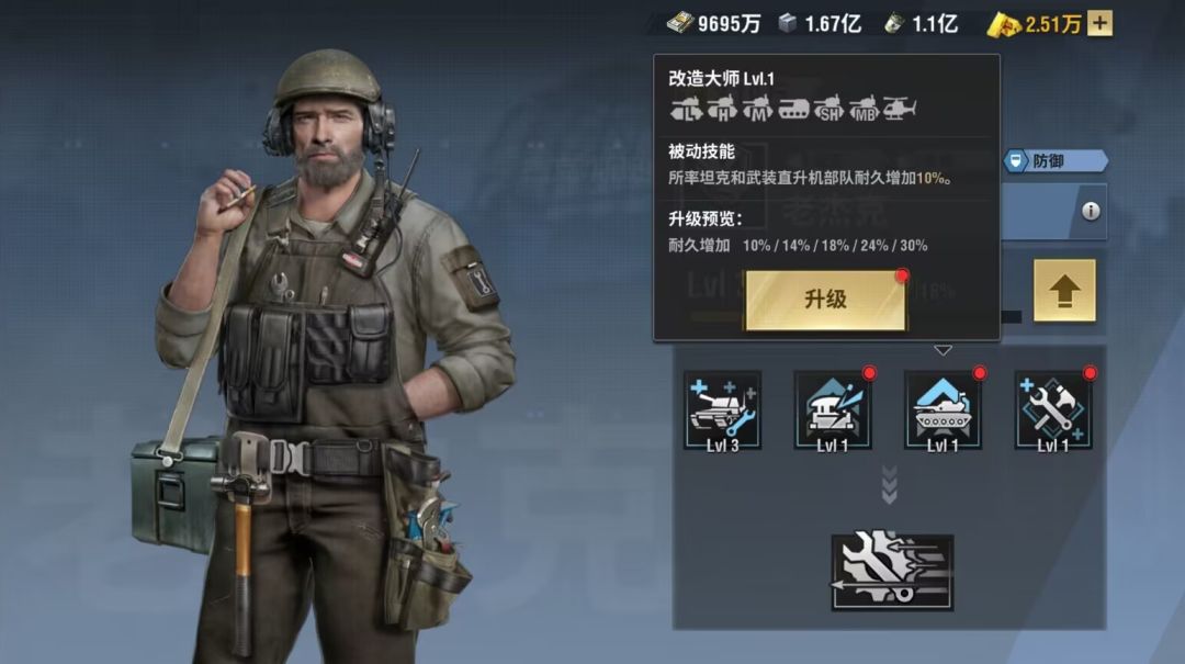 第三个技能:改造大师所率领坦克和直升机部队耐久增加,随着技能等级增加(最低10%,最高30%)简单粗暴的增加血量,让抗伤更持久,是通用性比较强的技能,非常适合肉;这里提到的直升机是后期坦歼的进化兵种,要在180天以后才会出来,前期不用考虑;
