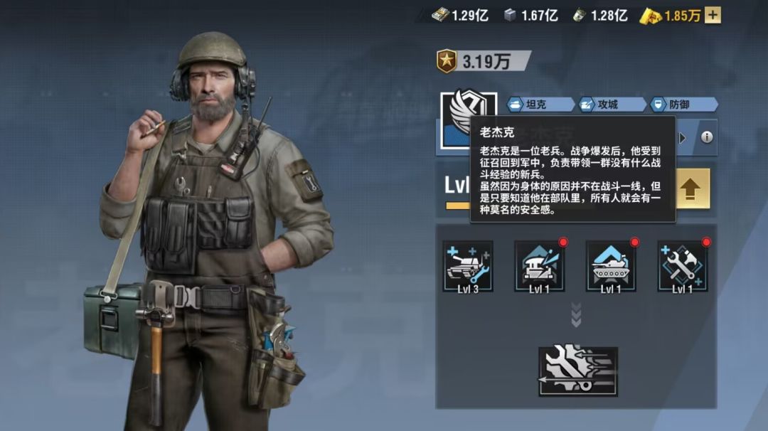 ,今天给大家带来纯新手向的军官指导攻略,老杰克的全面详解,让大家更好的知道老杰克这个军官的定位与用法。首先老杰克的设定是一个老兵,战争爆发后,他受到征召回到军中,负责带领一群没什么这都经验的新兵,由于身体的原因不在战斗一线,但是只要知道他在部队里,所有人就会有一种莫名的安全感老杰克的个人简介可以在下图这里查看《战火勋章》军官介绍之老杰克