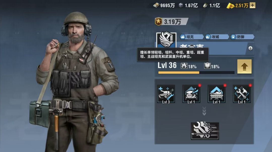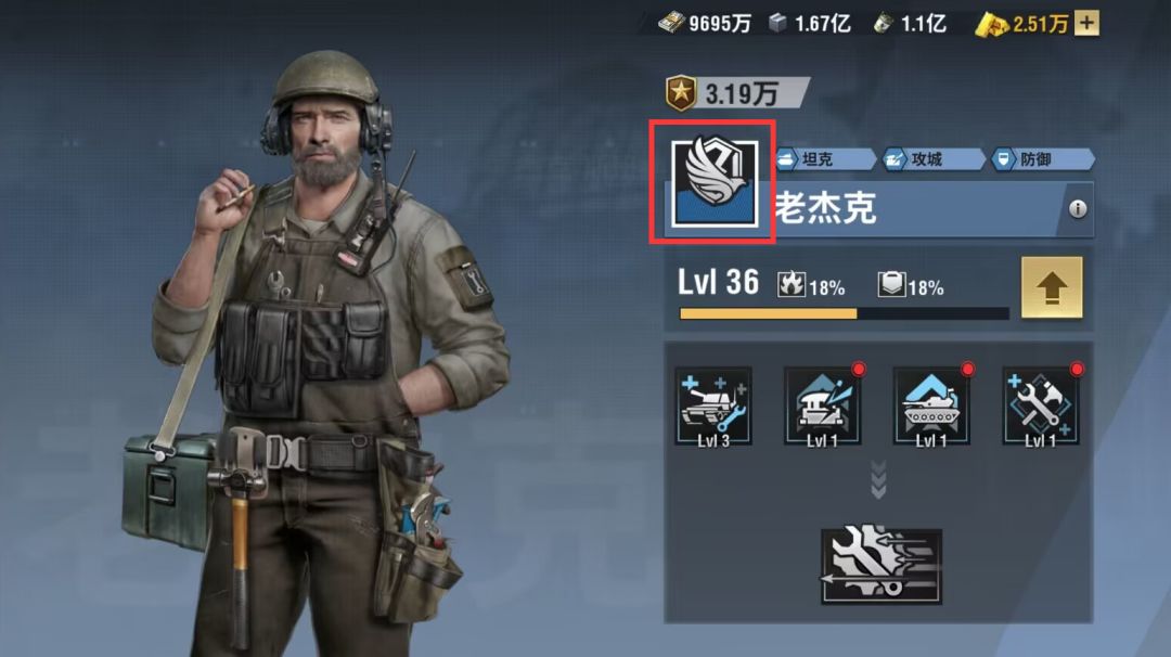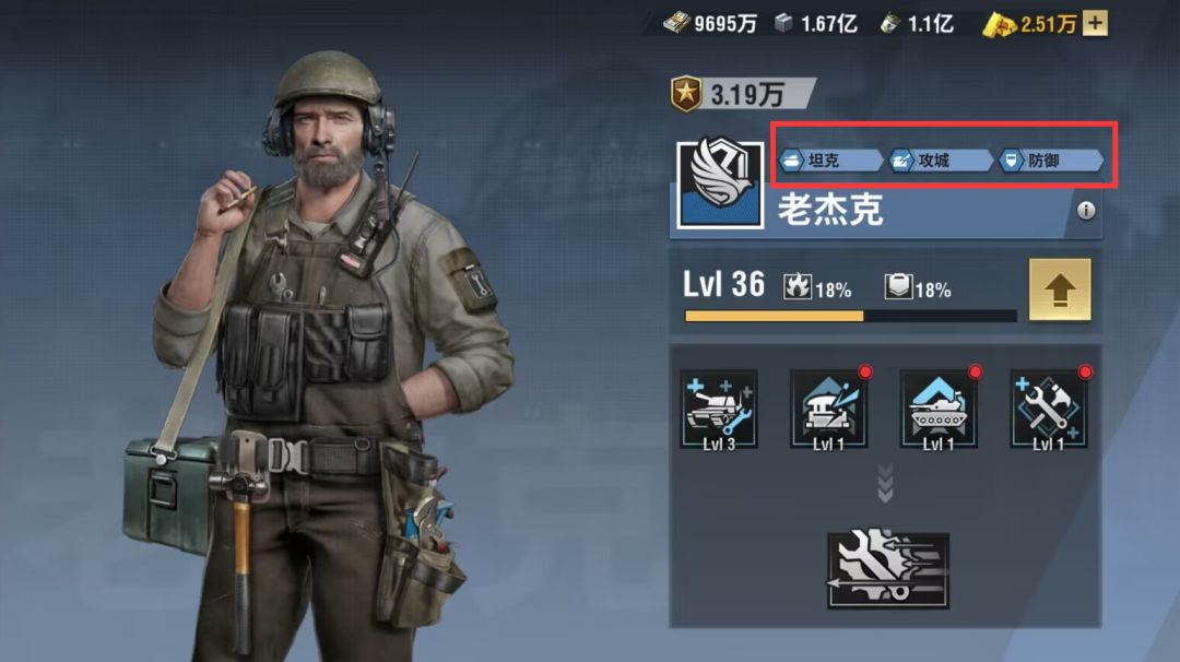 老杰克的定位是属于单系的军官,三大属性为,坦克、攻城、防御,是坦克专属的军官,坦克使用会有技能的加成