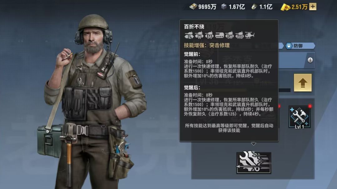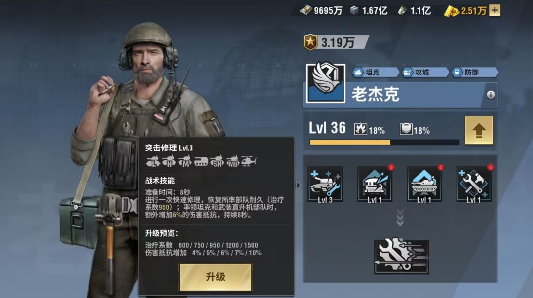 第一个技能:突击修理进行一次快速修理,恢复所率领部队的耐久,治疗系数随着技能等级增加(最低600,最高1500);率领坦克或者直升机部队时,能额外增加百分比的伤害抵抗,随等级增加(最低4%,最高10%),持续8秒!回血量还是比较可观的,尤其是比较肉的一些坦克,像超重,重坦,能回的很舒服,而且还有减伤效果的加成,使得老杰克变成一个必不可少的坦克军官!
