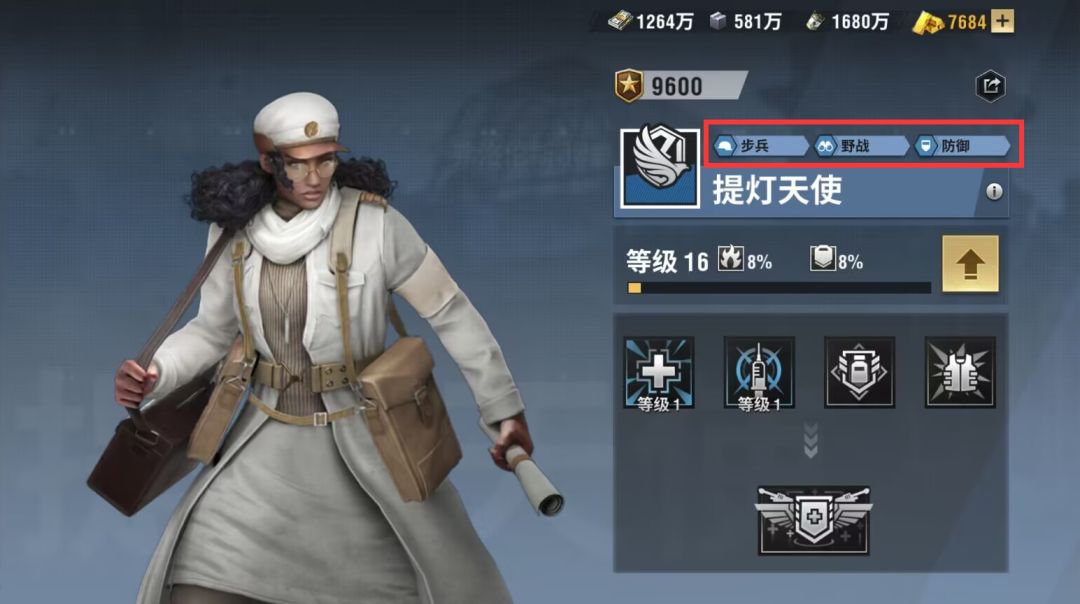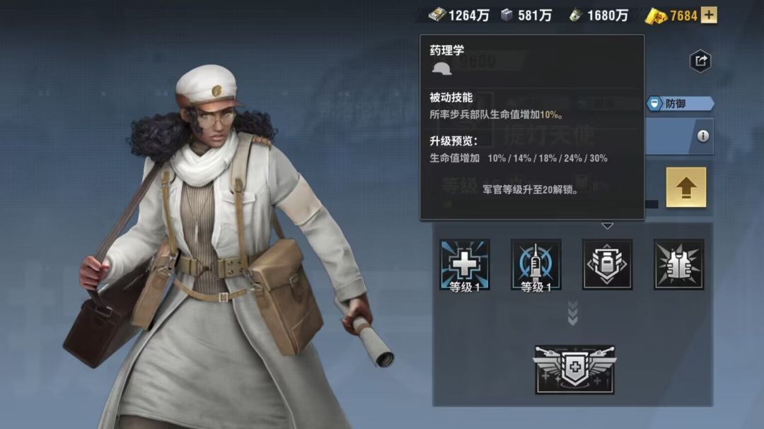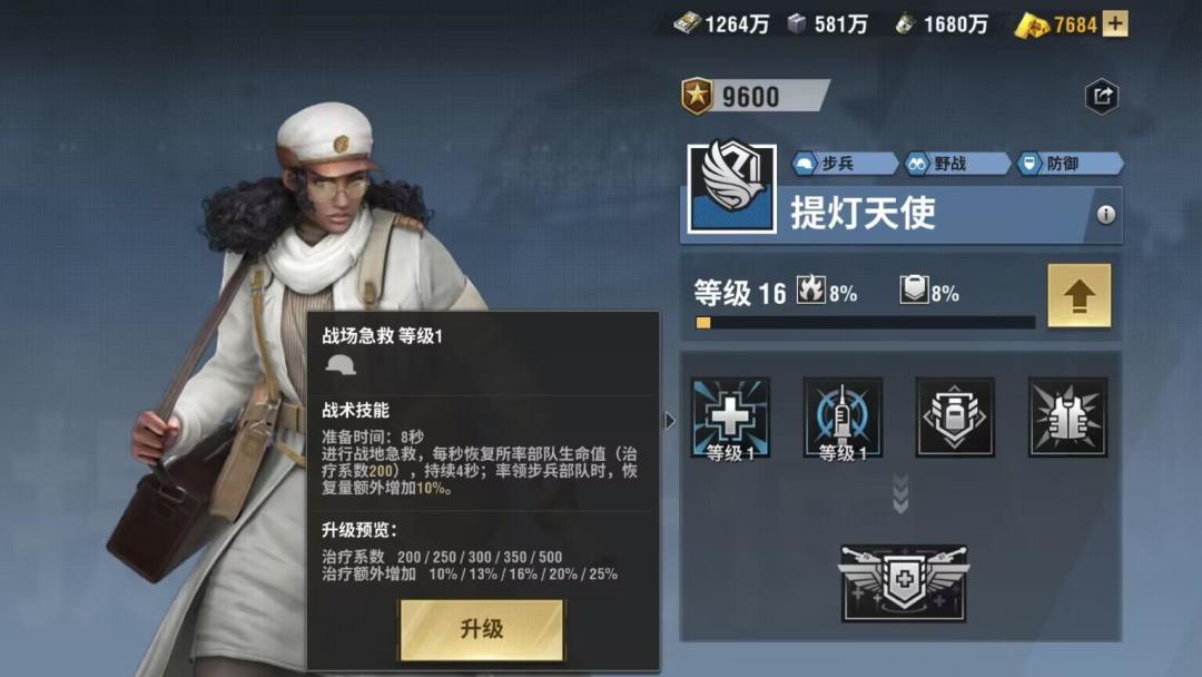 第一个技能:战场急救进行战地急救,每秒恢复所率部队生命值治疗量,最低为200最高为500,随着技能等级提高,持续4秒,率步兵单位时,恢复量额外增加10%在前期的军官中,按照使用步兵每秒来算,最高就是能恢复2200的血量,没有一个军官的回血量能比他还高了!