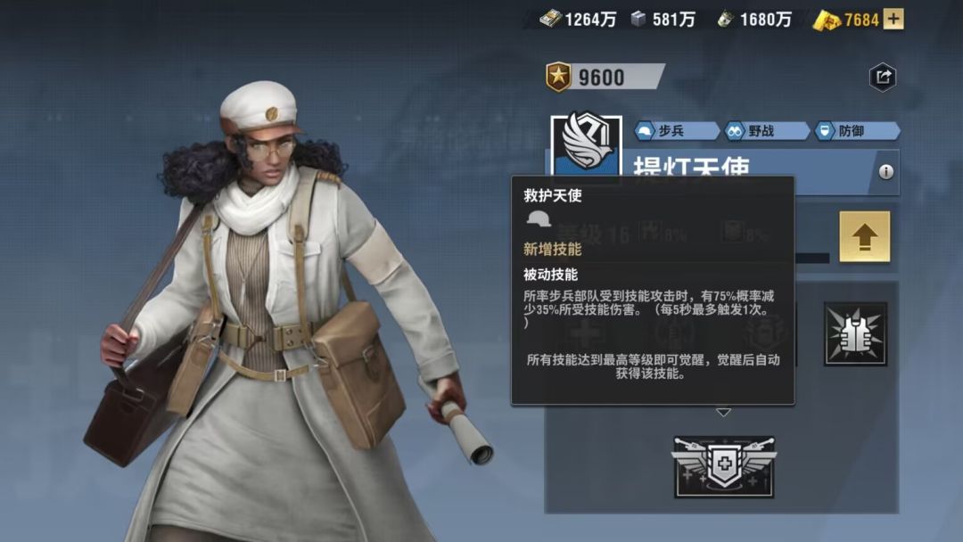 觉醒技能:救护天使所率步兵部队受到技能攻击时,有75%概率减少35%所受技能伤害(每5秒最多触发1次)这个技能让步兵的单挑能力更加强大,并且触发概率也是挺高的,但是有5秒触发一次的限制,所以只限于单挑能力,如果没有这个限制的话,在团战中也是非常强大的!