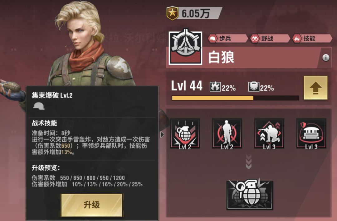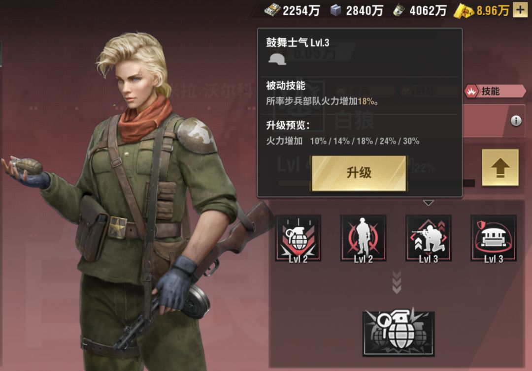 第三个技能:鼓舞士气所率步兵部队的火力增加,随着技能等级增加(最低10%,最高30%)最高级30%的火力加成,算是军官里面加成最多的了,不过只有步兵部队才有这个加成,所以想发挥白狼最大的作用,还是需要搭配步兵!