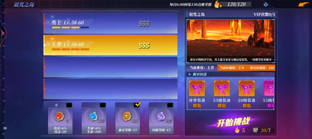 首先是诅咒之岛,此副本分为勇士和王者两个级别,如果角色的魔抗值不足400,那么可以先选择打勇士级别的,用副本掉落的时空刻印去兑换53级史诗装备,此时地目的是叠魔抗值。当我们的魔抗值高于400时,就可以去打王者级别的诅咒之岛,此时副本会掉落58级橙装,远古时空刻印等等,没有掉落出本职业的橙装也不要紧,可通过远古时空刻印去传奇之路兑换58级本命装备。