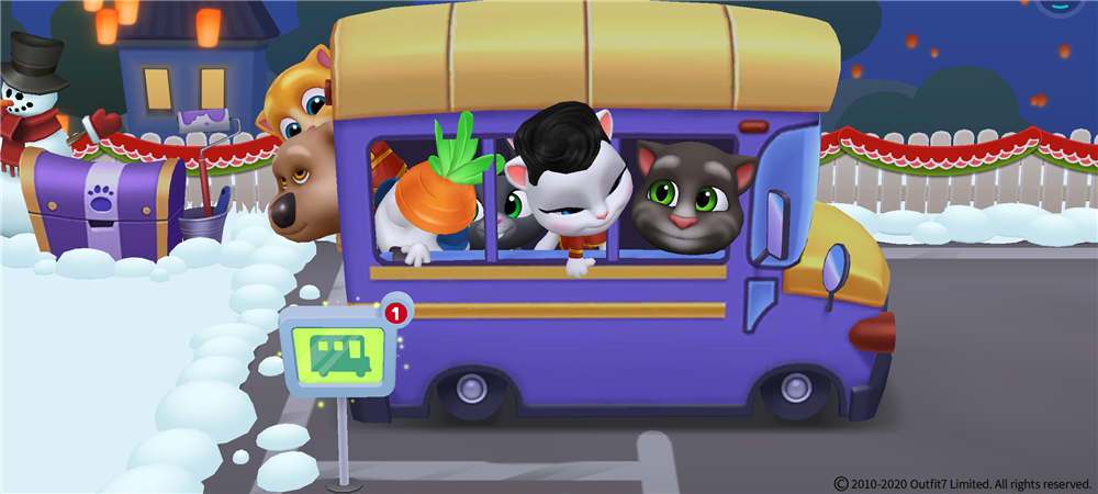 《汤姆猫总动员》游戏中,前院小花园门口有随时待命的小巴士,使用巴士特别货币(可通过日常、或者玩小游戏、购买获得)可搭乘小巴士前往城镇逛街。