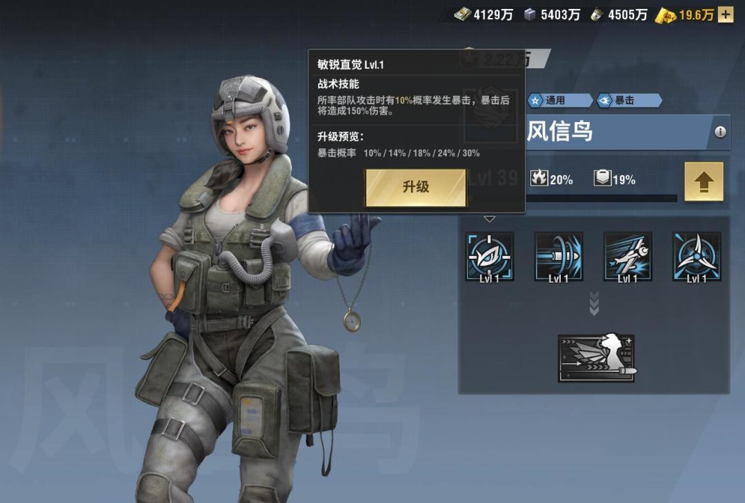 第一个技能:敏锐直觉所率部队攻击时有概率发生暴击,暴击后将照成150%的伤害。(概率为10%-30%,随着技能等级变化而提升)增加暴击的概率,少有的属性,并且只有空军才会有的属性,增加了150%的伤害,类似于陆军坦克的穿甲,这个技能增加的概率数值还是挺高的