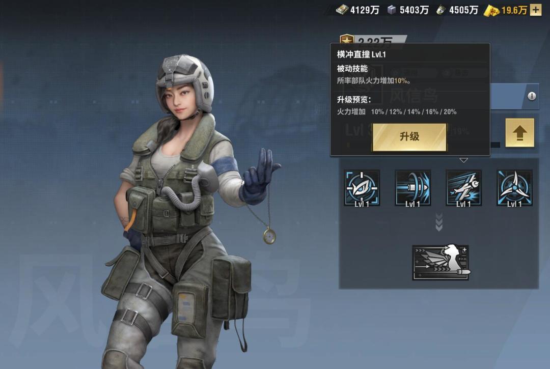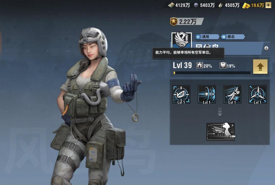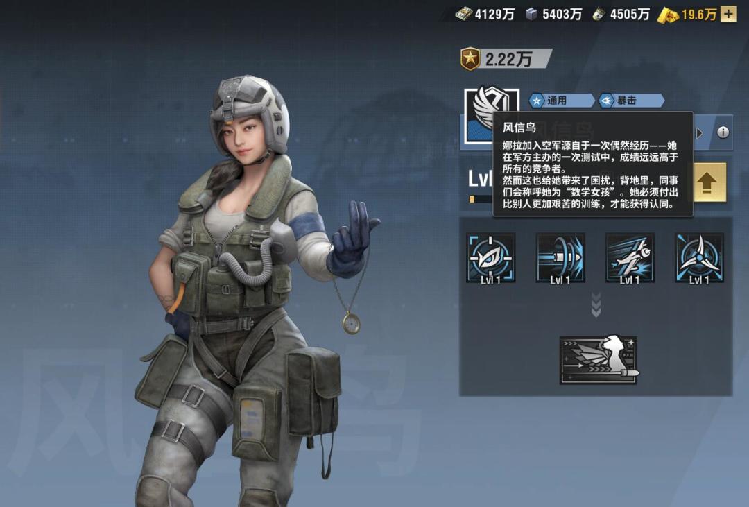 。我们这回给新手玩家讲解一下通用型暴击属性的空军军官——风信鸟,让大家更了解一下这个军官的定位、技能解析以及推荐加点等!我们先来看看风信鸟的背景娜拉加入空军源于一次偶然经历——她在军方主办的一次测试中,成绩远远高于所有的竞争者。然而这也给她带来了困扰,背地里,同事会称呼她为“数学女孩”。她必须付出比别人更加艰苦的训练,才能获得认同。看她的介绍,我们都不难看出她的天赋极高,并且还非常的努力,这也成就了她的属性也是属于比较强的类型,几乎与所有的输出型军官搭配都会比较的强