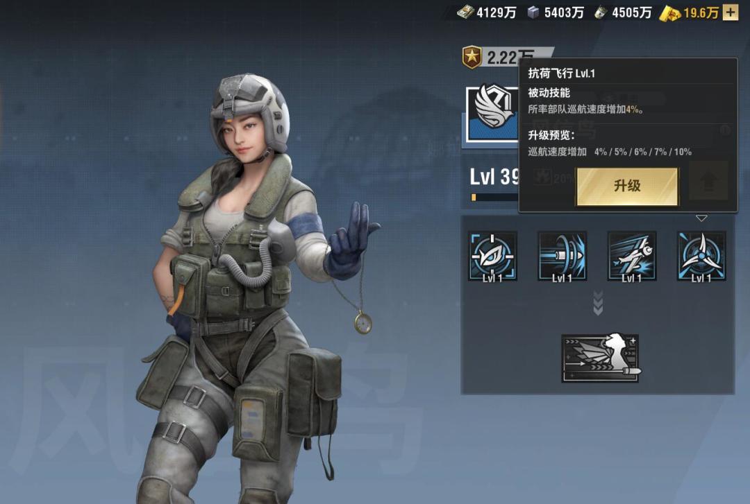 第四个技能:抗荷飞行所率部队巡航速度增加(增加速度为4%-10%,随着技能等级变化而提升)增加了飞行的移动速度,在赶路过程中时间会更短一些,算是一个比较有用的技能,能跑能追