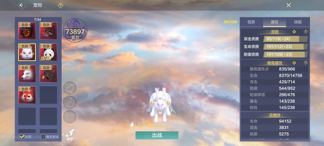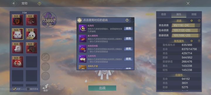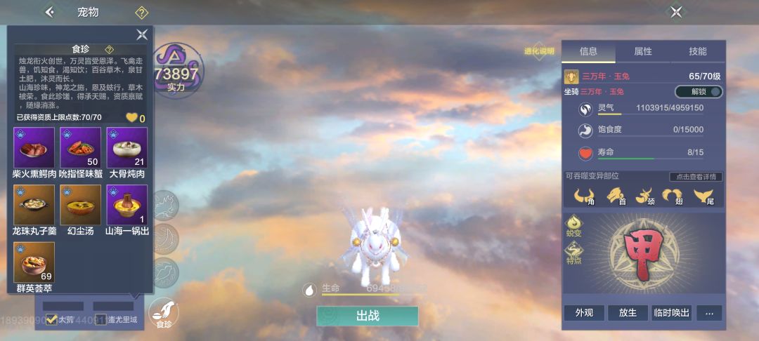 2.提升资质。宠物资质和宠物年限有关,3万年够用了,70点。提升宠物资质主要是吃食珍提升资质上限,然后喂化育丹。食珍分为百年食珍,千年食珍,万年食珍,前面先吃百年食珍将宠物的资质拉满,后面再吃千年食珍洗资质。获取方法:1,自己肝食珍皮,灶台做。2.拍卖行求购