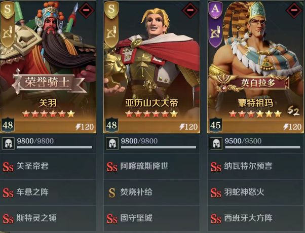 关羽发动【真·车悬之阵】时有概率使自带技能跳过准备阶段,并且提供高额的增伤,打出爆发伤害。亚历山大大帝作为坦克负责提供嘲讽、保护效果,以便提高队伍的容错率。