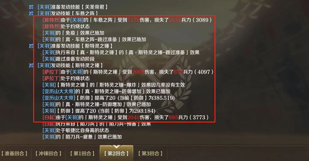 由战报可见,在第二回合中,关羽攻击处于灼烧状态下的腓特烈,直接打出高额的爆发伤害,三个回合直接带走对面的突击队。