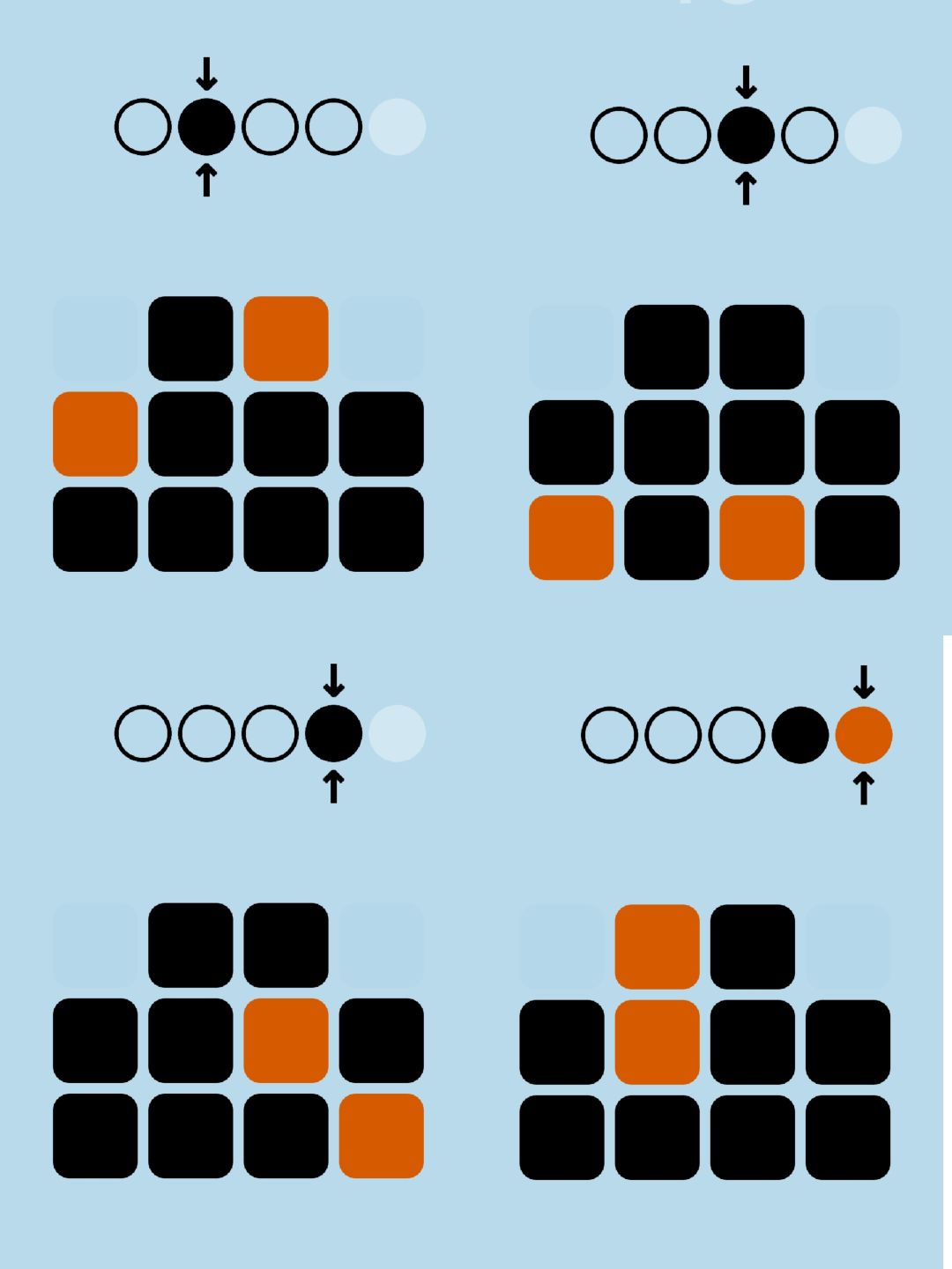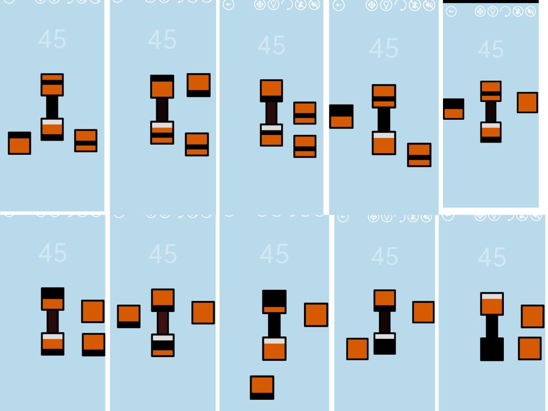 第45关:这关有四个容积为四格的方形容器,还有一根黑色长条形的管道。容器里装有橙色和黑色两种液体,其中一个容器还没装满,有一格白色的空气。管道可以把一个容器底部的液体转移到没装满的容器的顶部。我们的目标是把分散在四个容器中的四格黑色液体集中在同一个容器中。一种方法如图所示: