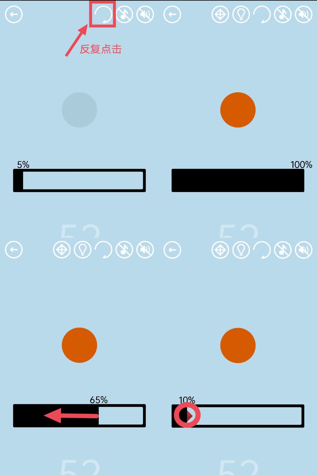 第52关:反复点击重新开始,进度条会越来越长,达到100%即可得到通关按钮。此时再把进度条拉到最左边,得到红宝石。