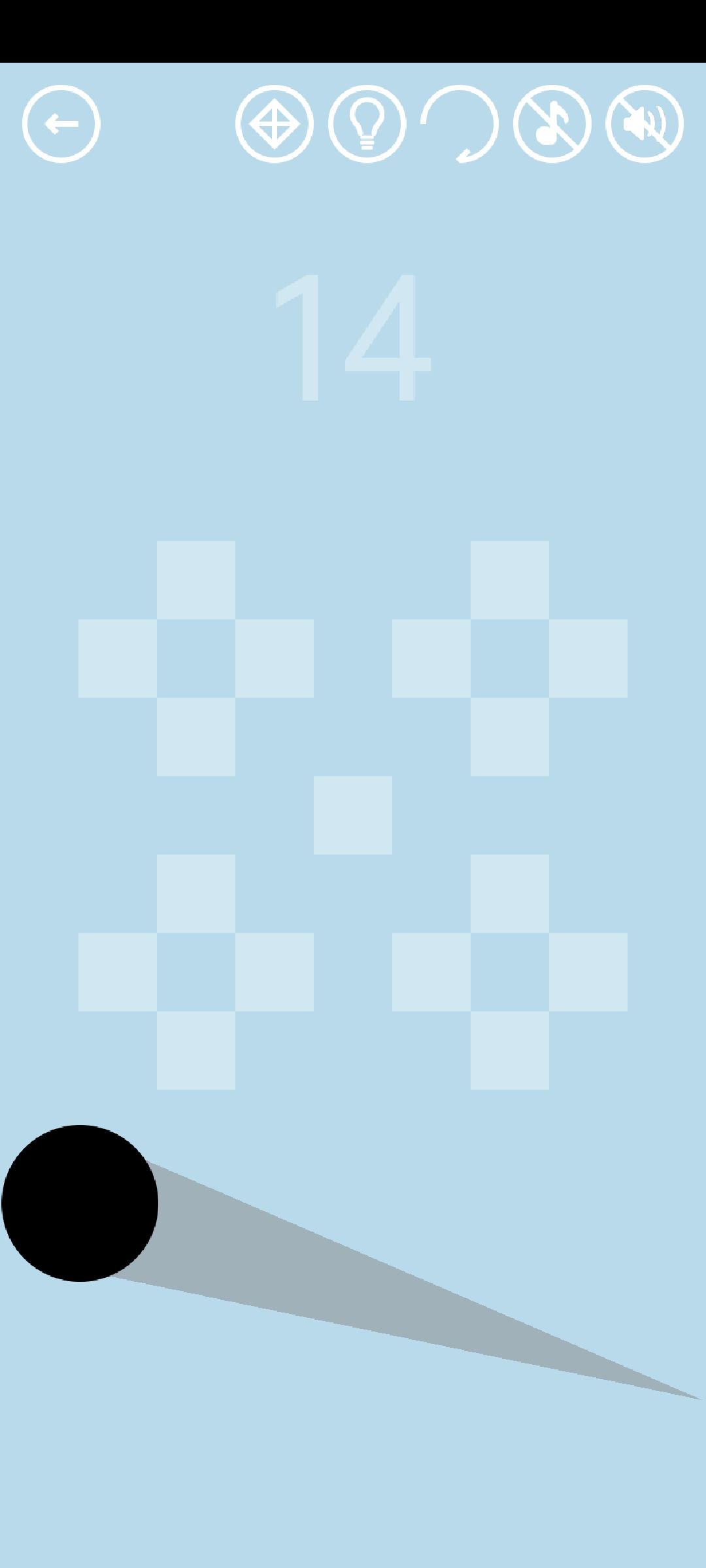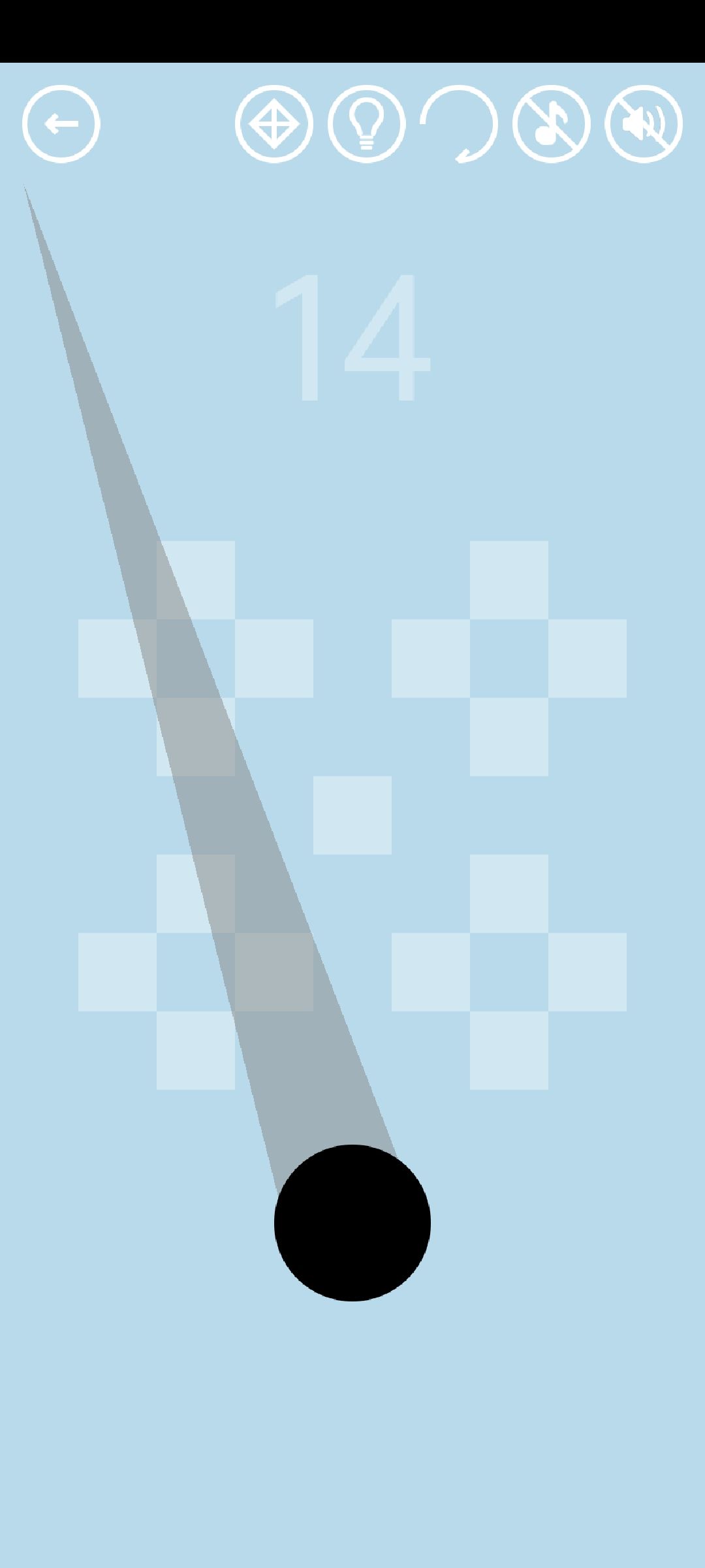 第14关:按住黑球滑动,黑球会反方向弹射出去。用一次弹射经过所有小方块即可得到通关按钮。思路是找准角度+充分蓄力,图示为两种通关方法:
