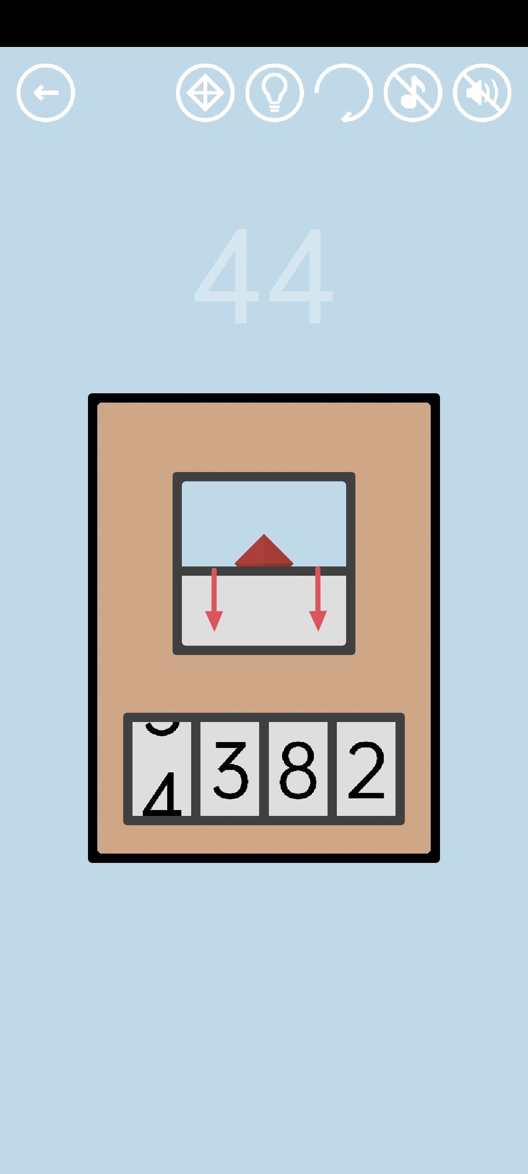 第44关:这关要破解密码锁。如果拨到某个数时其他格子里的数抖动了一下,那么拨到的这个数就是这一格的正确密码。把四个密码都试出来即可获得通关按钮 。将显示屏(中间白色方块)的顶部往下拉,得到红宝石。