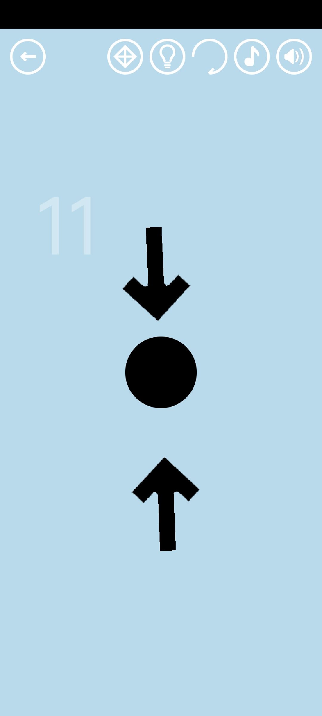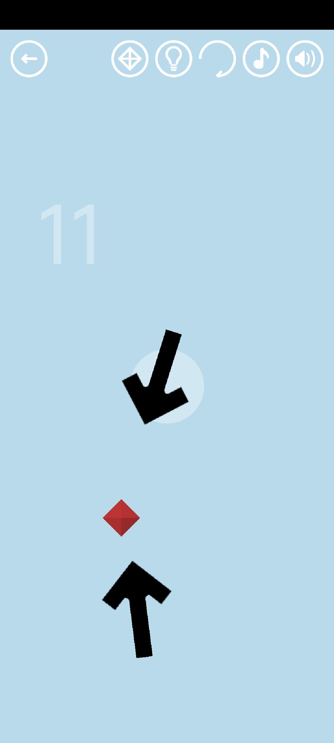 第11关:拖动箭头时,箭头指向的方向是移动方向的反方向。让两个箭头同时指向中间的白色轮廓,即可得到通关按钮(最简单的方法是把下面那个箭头竖直拖向上,把上面那个箭头竖直拖向下)。