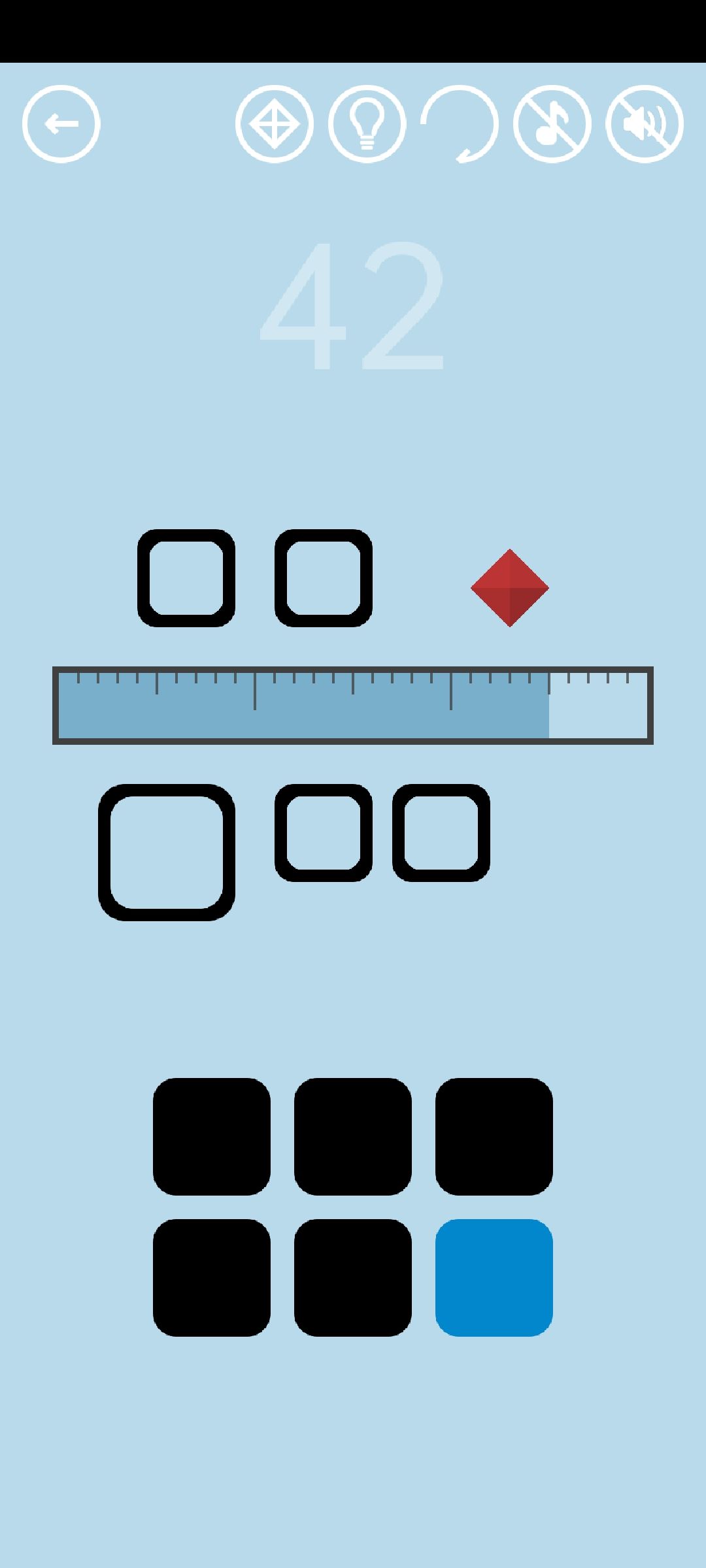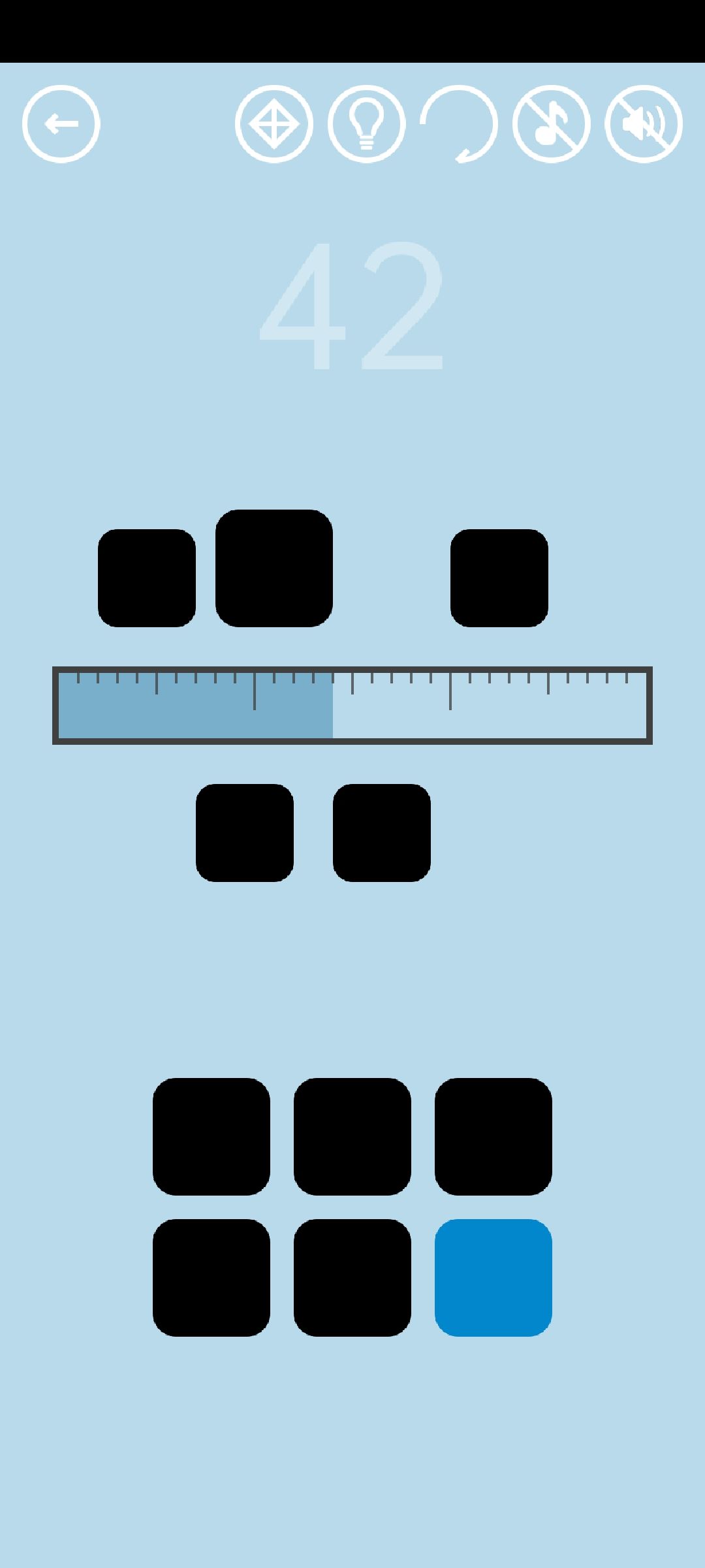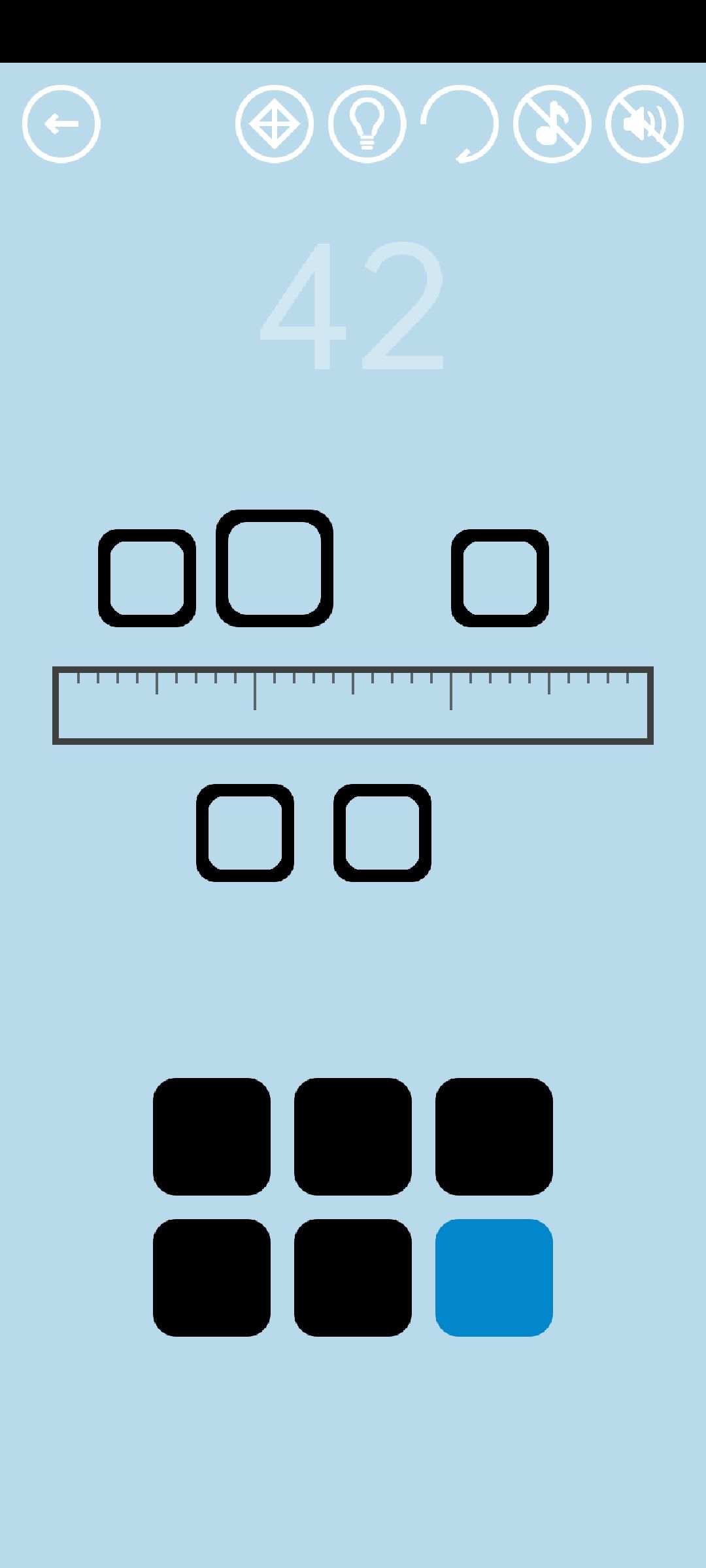 第42关:注意观察刻度尺上下的5个空白方形,四个小方形的边长为5mm,最后一个大方形的边长在6到9mm之间随机变化。下方的六个按钮,前五个是长度按钮,依次表示1、2、3、4、5mm,最后一个蓝色的是归零键。点击下方的长度按钮,使长度累加,一直到与某一个空白小方形的左侧边平齐,然后再加上这个小方形的边长——5mm,就能让这个小方形变成黑色。变黑的小方形会变成新的长度按钮,把四个小方形依次变黑,会发现它们表示的长度分别是6、7、8、9mm。最后一步是将大方形也变黑,方法与之前相同:先累加长度到与大方形的左侧边平齐,然后加上大方形的边长(前面提到,大方形的边长在6到9mm之间随机变化,也就是说刚刚被变黑的四个小方形所代表的四个长度总有一个适合它)。点击变黑的大方形即可通关。