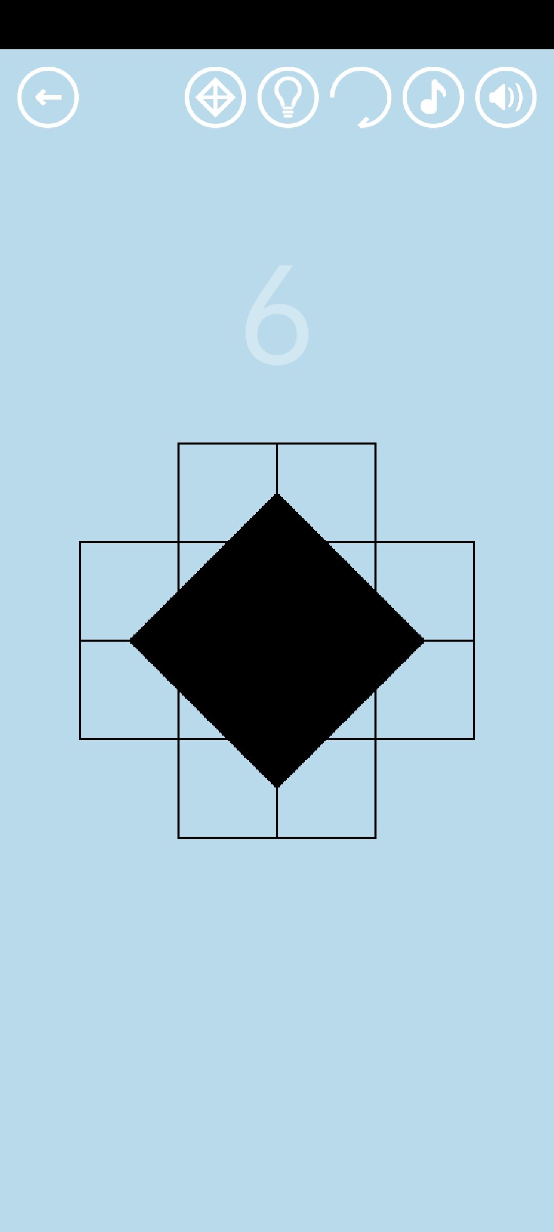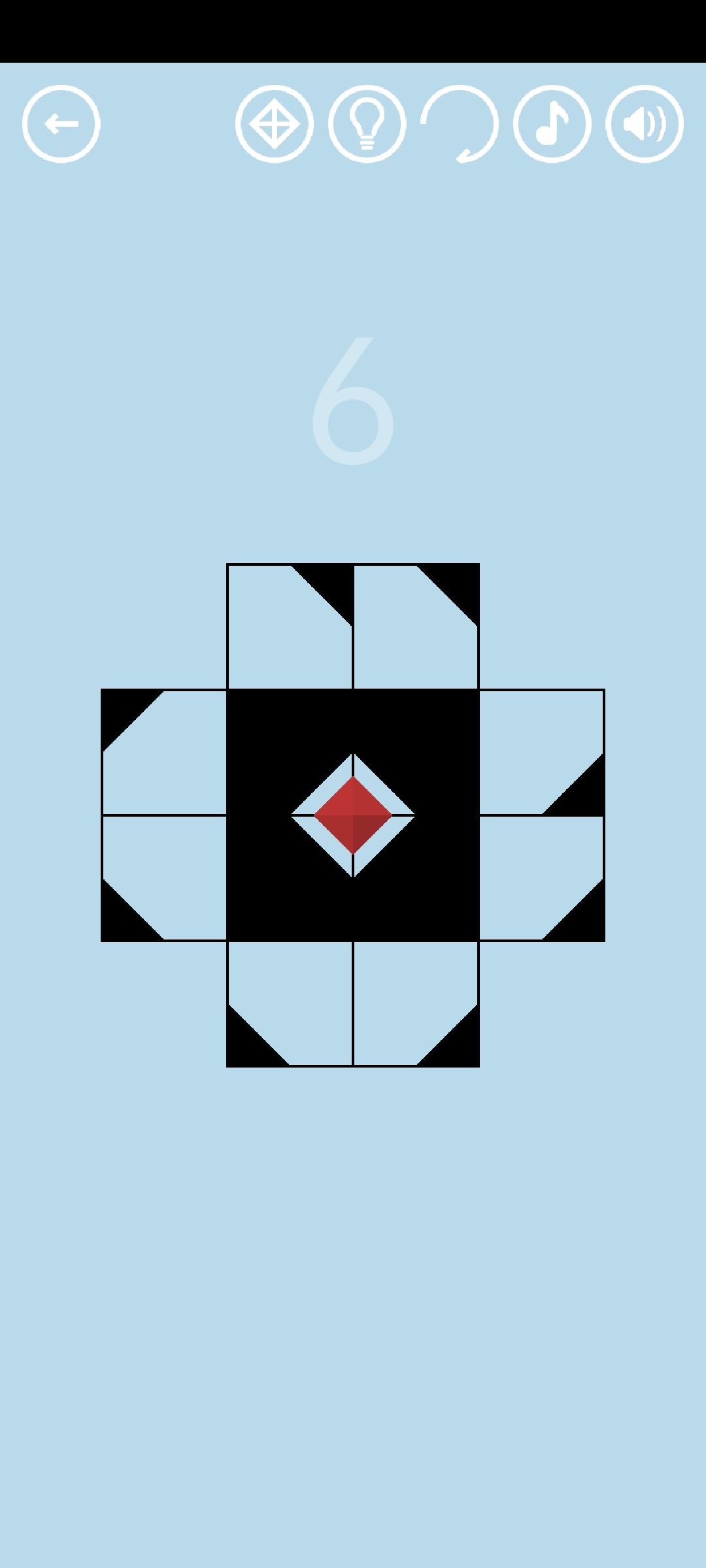 第6关:转动中间四个方格拼成白色小菱形,得到红宝石。转动所有方格拼成黑色大菱形,点击即可通关。