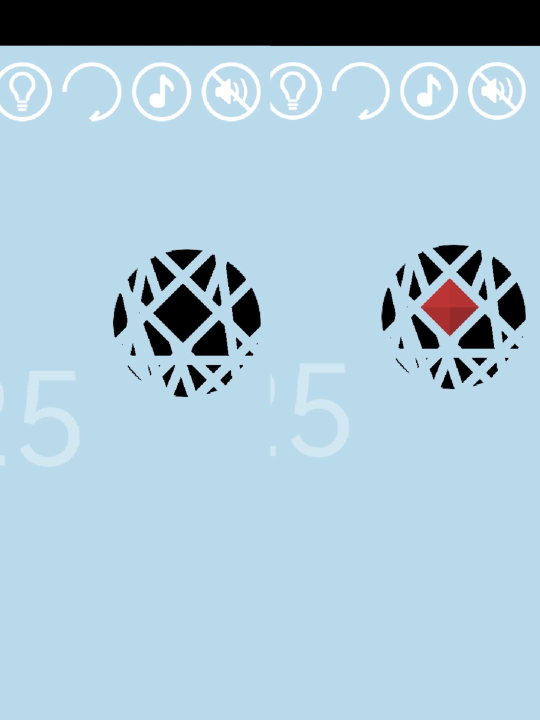 第25关:拖着圆形满屏幕仔细找,找到比圆形面积还大的一块黑色,得到通关按钮。找到一个黑色菱形,点击得到红宝石。