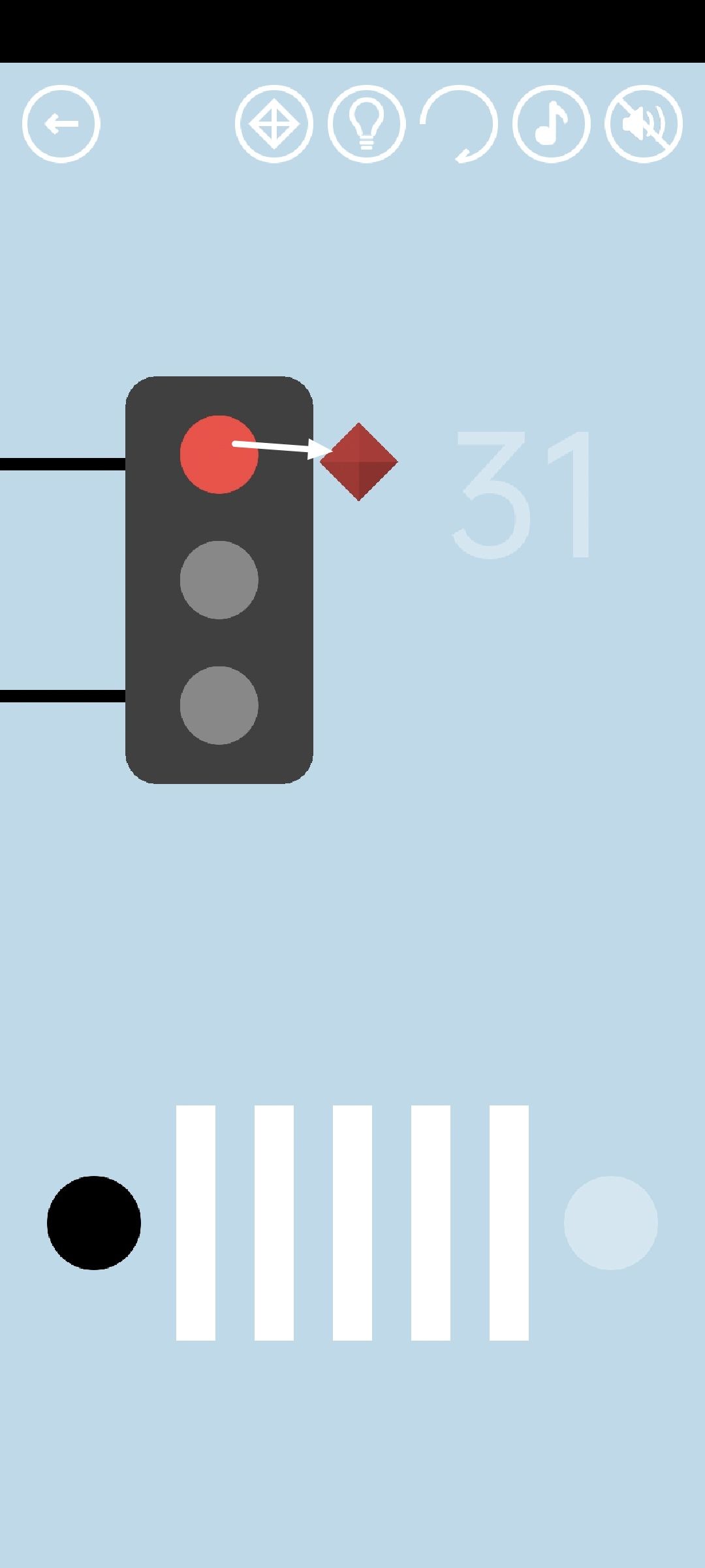 第31关:长按帮助黑球过马路,绿灯、黄灯行,红灯停。把红绿灯拆下来再装回去,可以让它从绿灯开始重新计时。到达马路对面的白色轮廓处得到通关按钮。红宝石藏在红灯里面,在红灯亮的时候可以把红宝石拖出来。