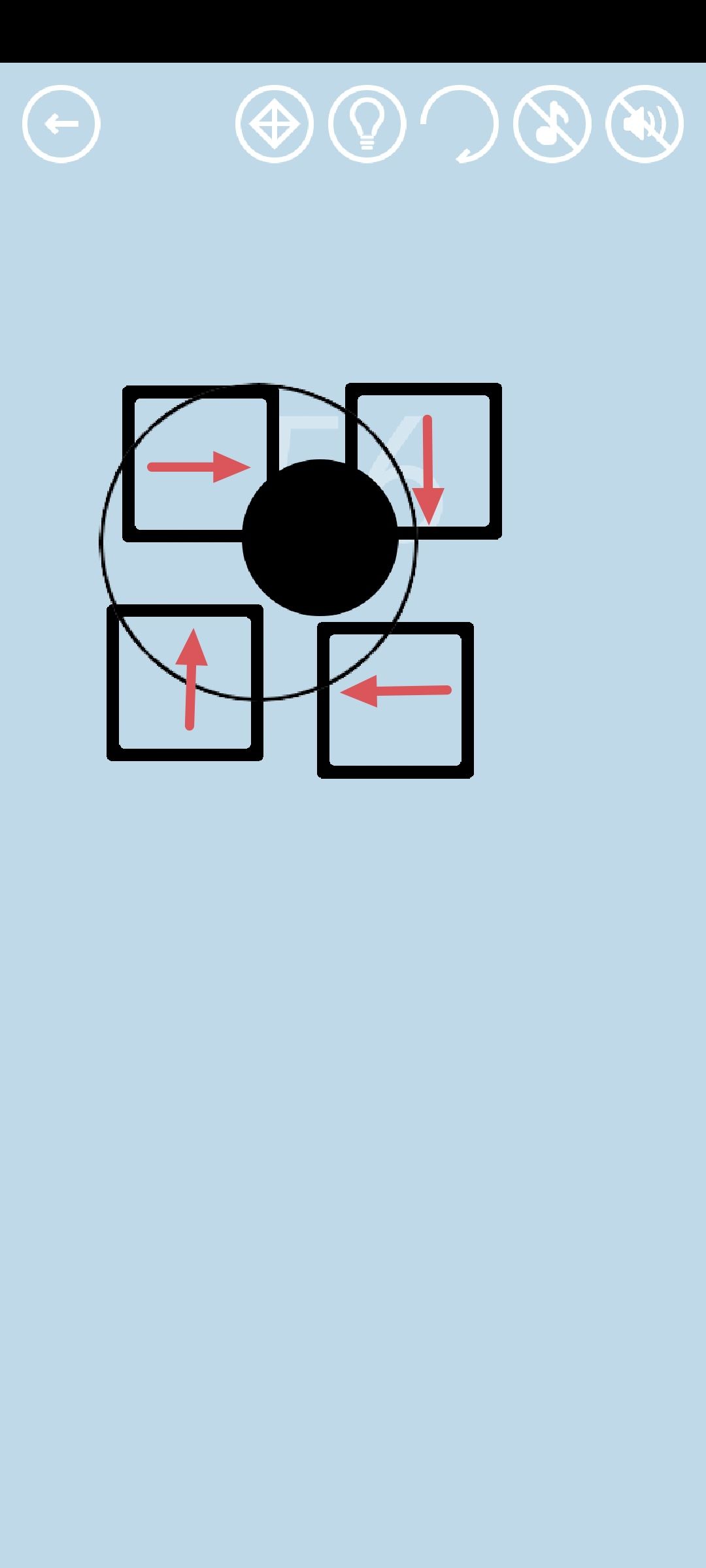 第56关:四个小方块接触圆时,分别能让圆向上、下、左、右移动,同时让自己这个方向的四分之一个圆颜色变深。让圆整个变成黑色(与每个按钮都接触至少五次)即可获得通关按钮。注意,圆一旦接触边框,颜色会全部清空,需要重新开始。一个简单快速的的方法是把四个小方块按顺序围成一圈,让圆在它们之间转圈。如图所示: