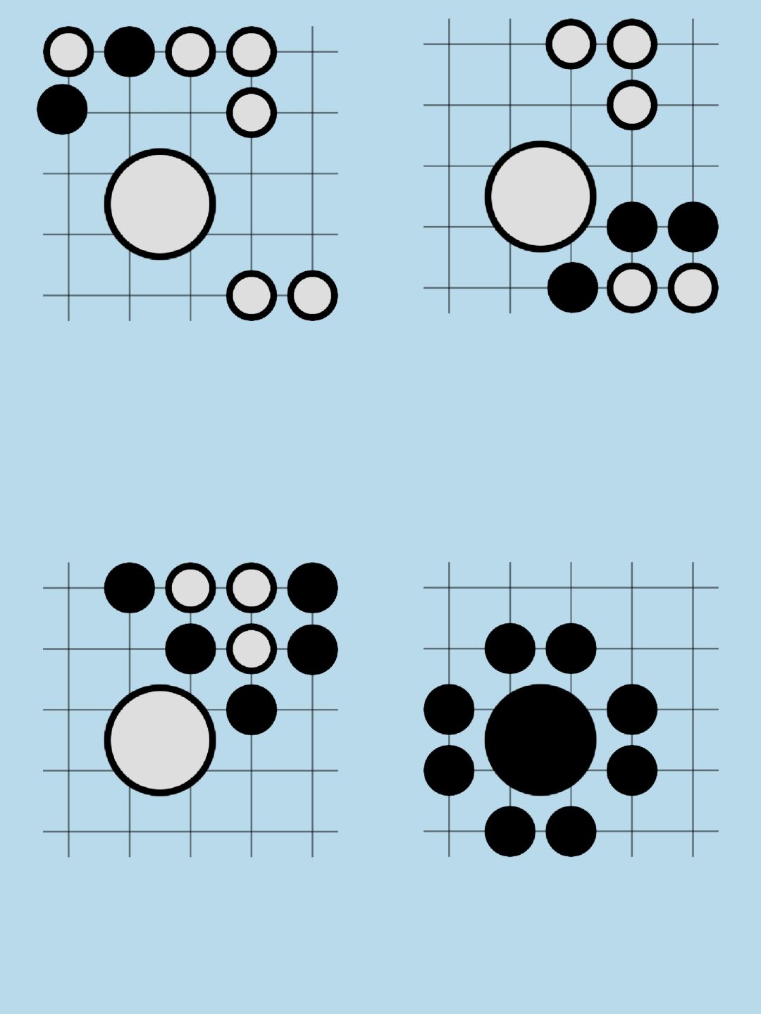 第22关:用两颗小黑子围住单独的那颗小白子可以让它变黑,类似“下围棋”。同理,将其他小白子变成小黑子。最后用所有小黑子围住大白子,得到通关按钮。