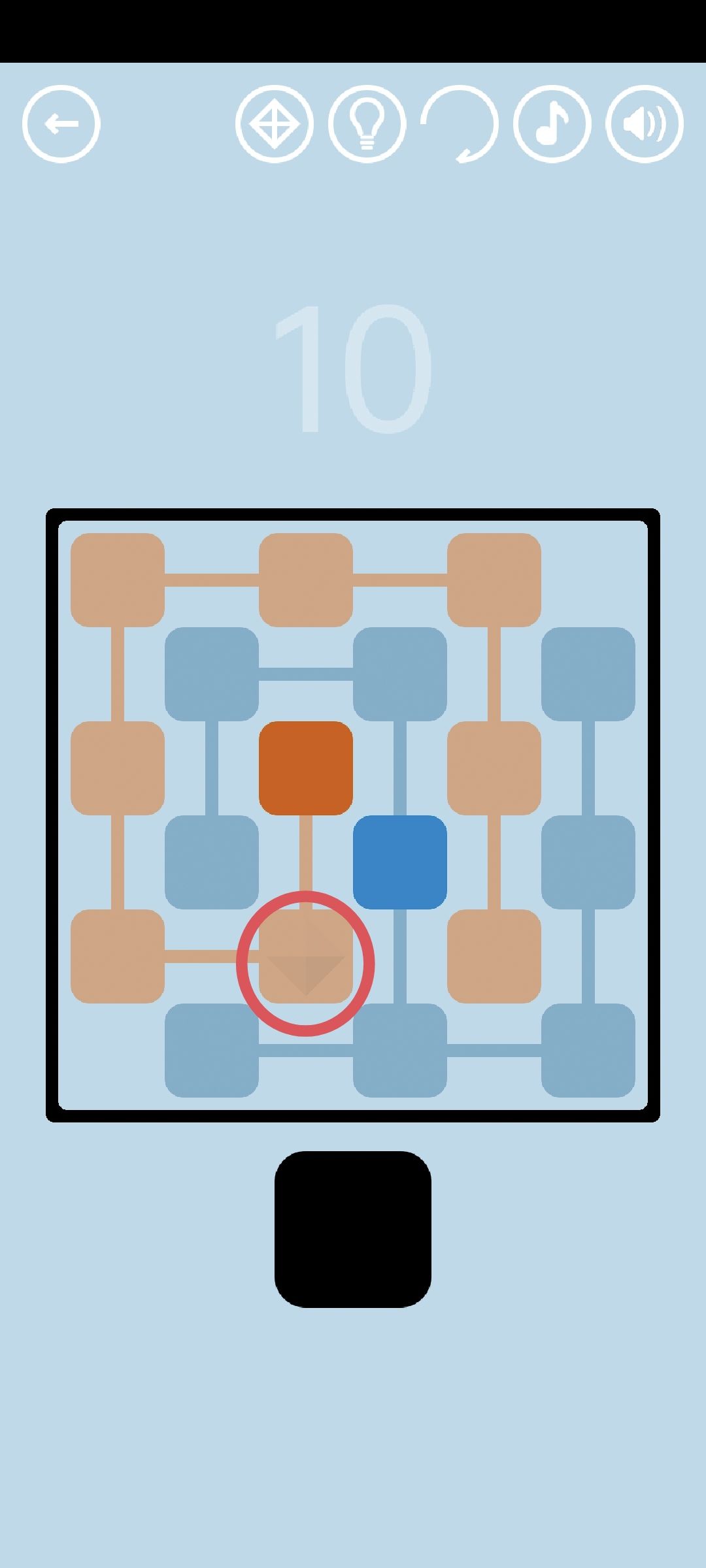 第10关:点击方块之间的间隙会出现连接线,点击连接线可使其改变方向。连接线可以将方块连接,与彩色方块连接的方块会变成彩色,使所有方块变成彩色即可通关。一种通关方式如图所示。红宝石藏在随机一个黑色方块中,该方块变成彩色时会显示出红宝石的轮廓(图中红圈处),点击此方块获得红宝石。