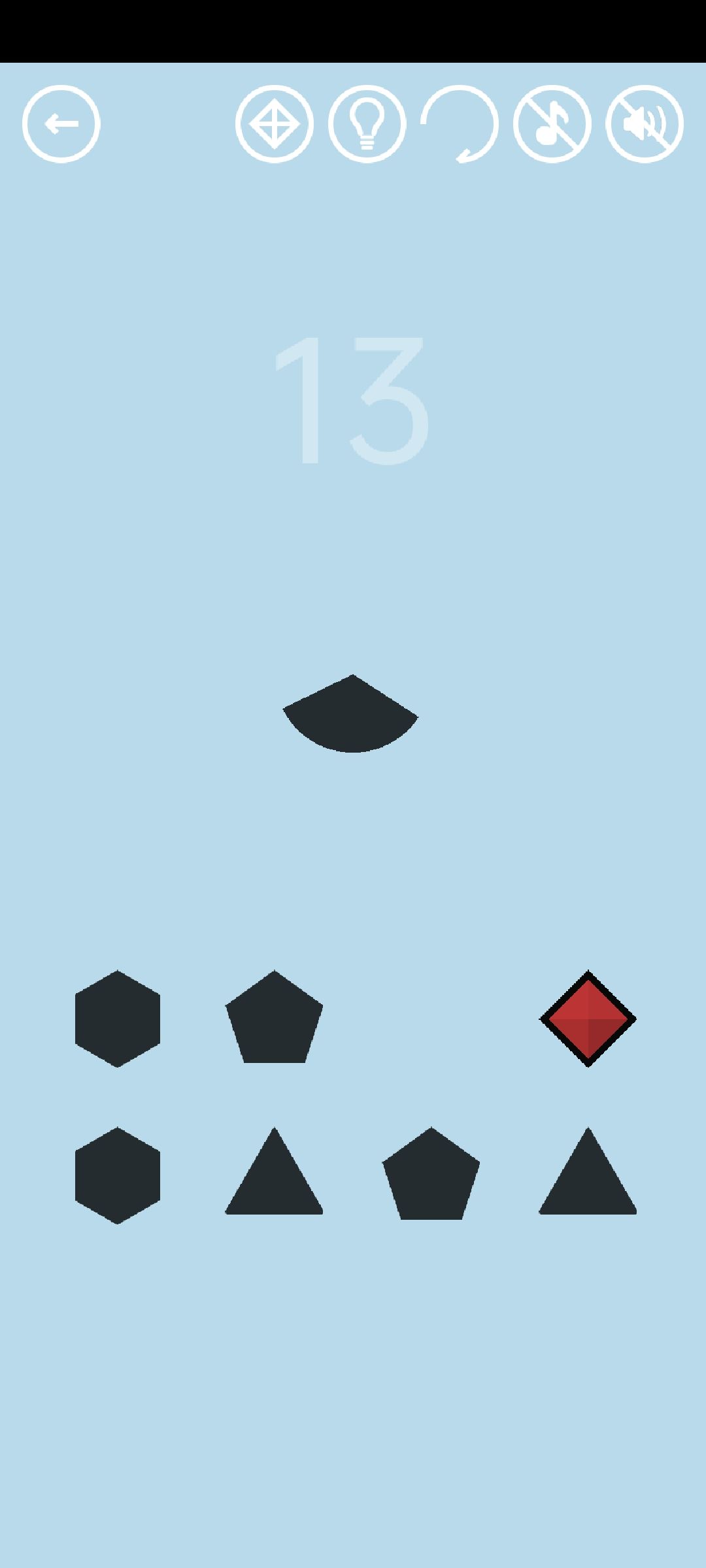 第13关:下方的每一个图形都连接着上面的一个小扇形,移动下方图形让扇形组成一个完整的圆即可通关。将下方的两个菱形重叠得到红宝石。