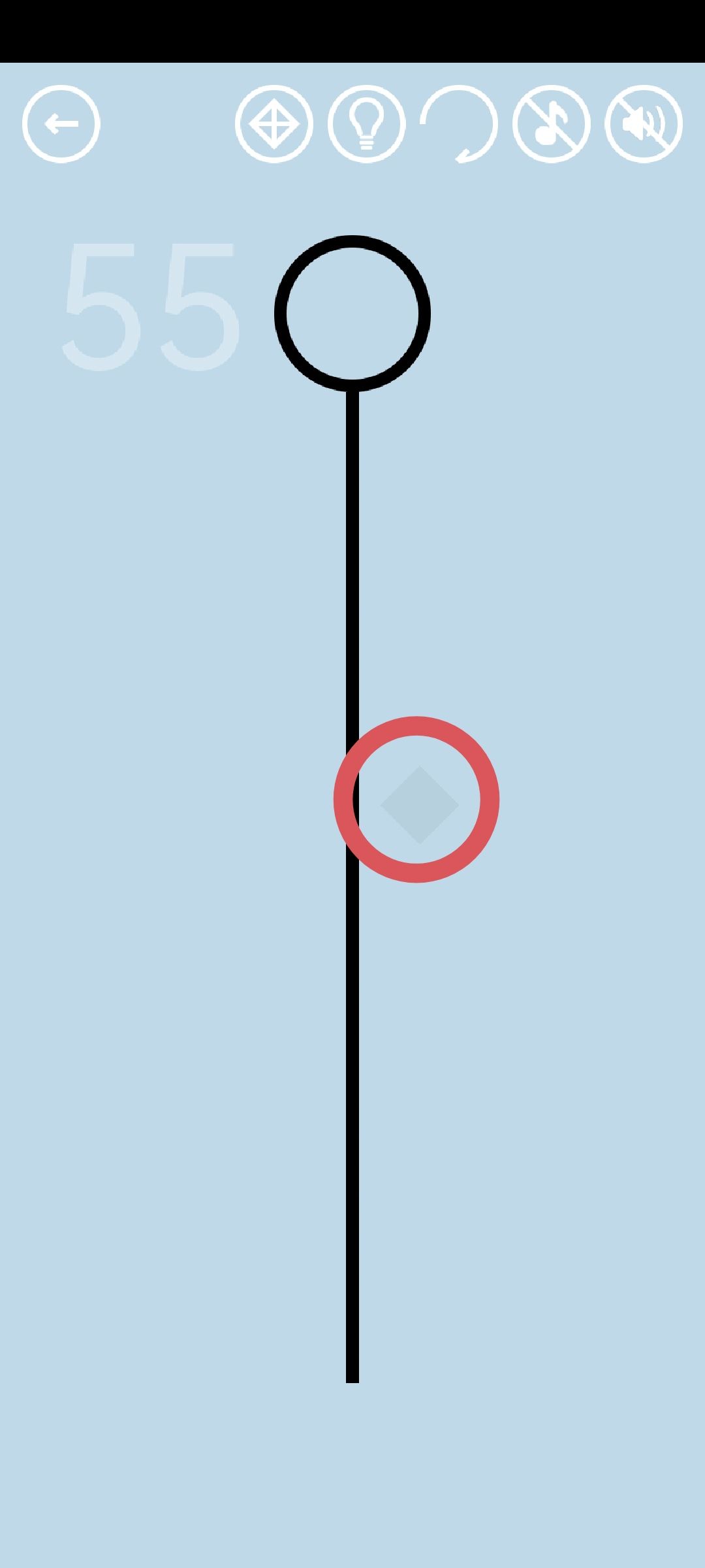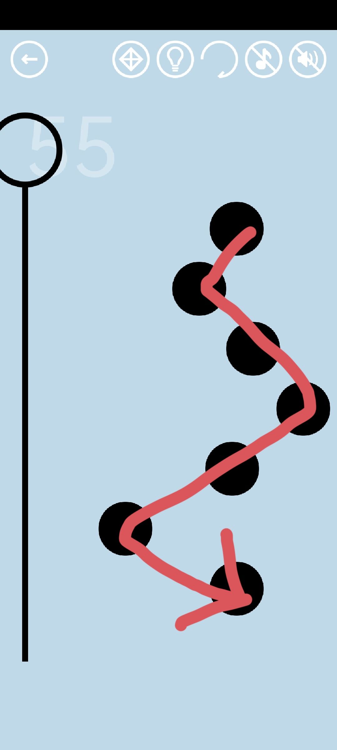 第55关:先左右滑动绳子使7个隐藏的黑球都现形。绳子与黑球接触时黑球会变橙色,使所有黑球同时变成橙色即可得到通关按钮。一种简单方法是手指按住最高的那个黑球,快速滑动到第二高的黑球处,以此类推,一直到最低处的黑球(手指滑动路线如图所示)。如果一次没有成功,就根据黑球的排列位置,调节滑动的速度和节奏再次尝试。