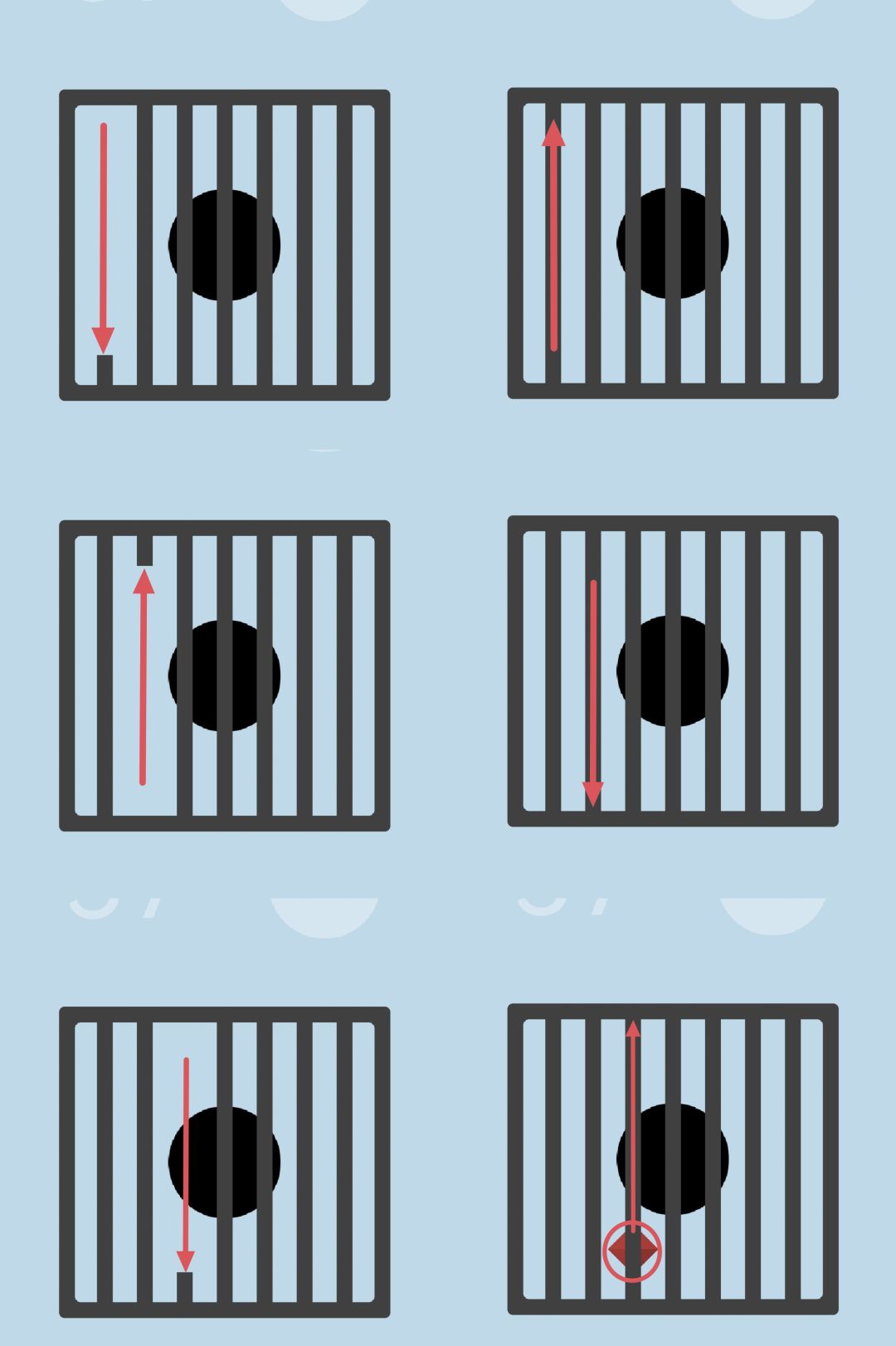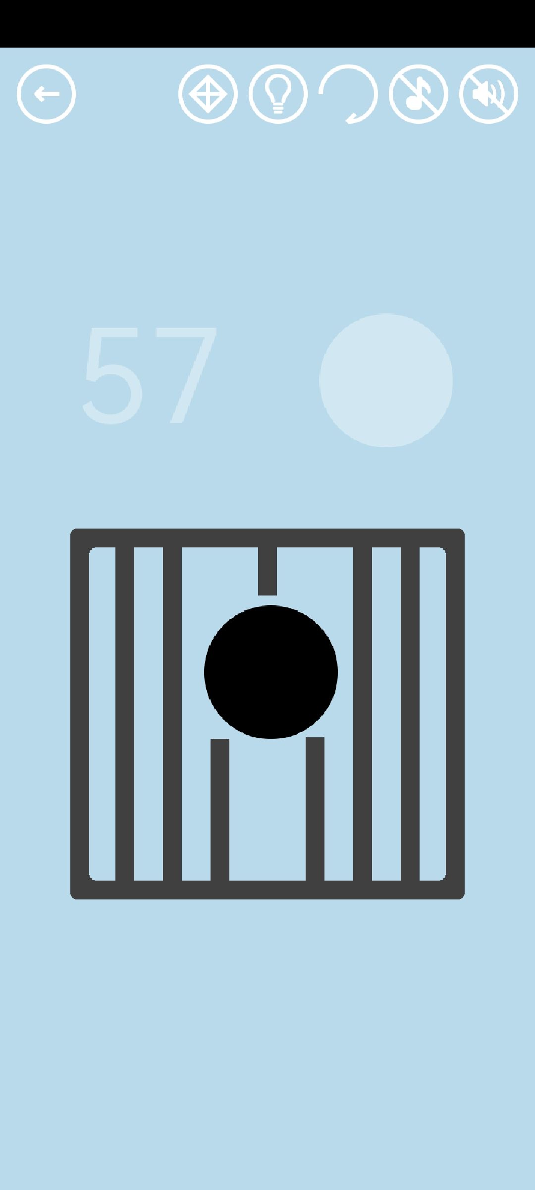 第57关:除了边框之外,每根长条都可以向上或者向下拖动,相邻长条的拖动方向相反。所有长条可被拖动的总距离是固定的。我们的目标是制造一个足以让黑球“越狱”的空隙。一种方法如图所示: