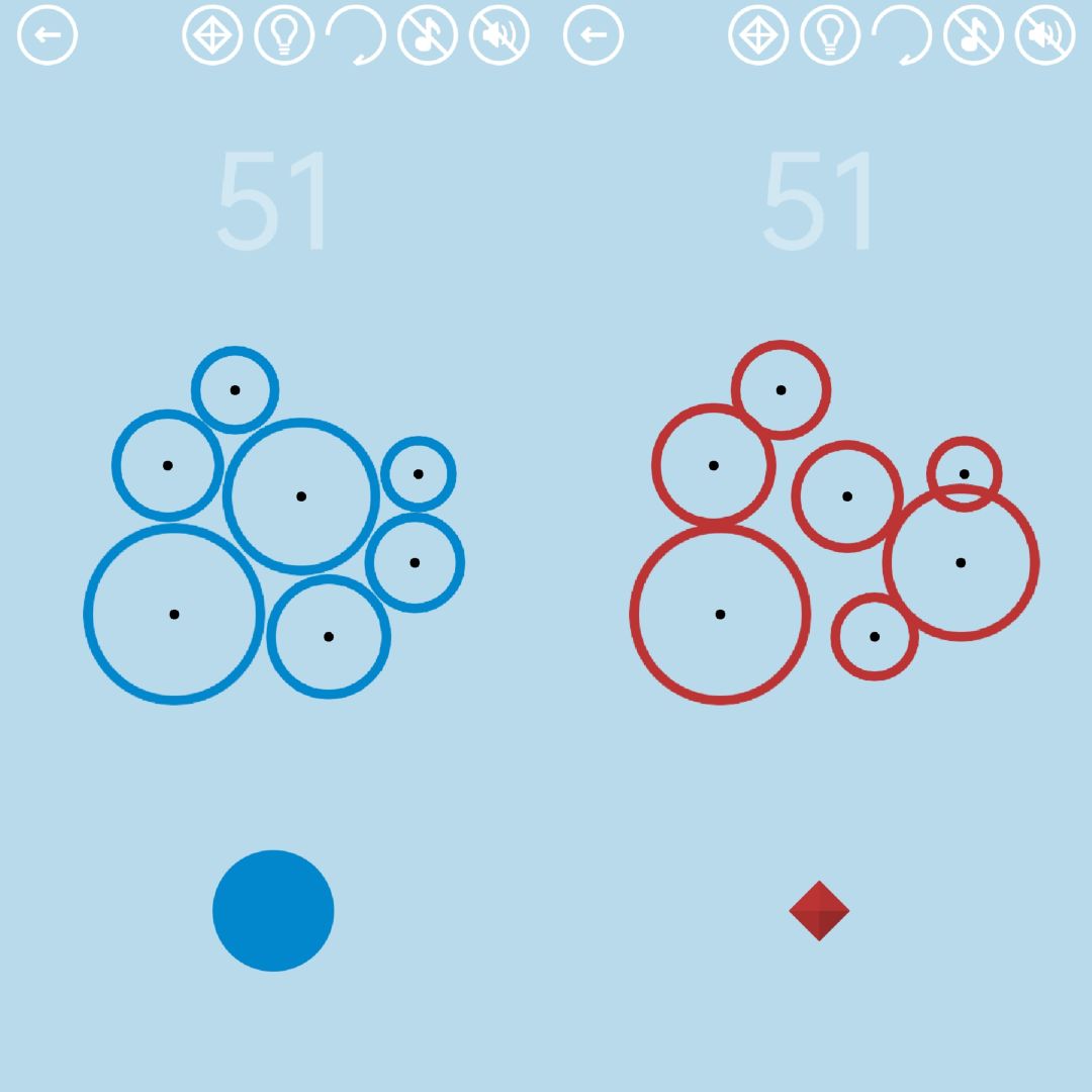 第51关:把下方大小不等的圆摆放到中间(小黑点指示圆心的位置),不与其他圆接触者呈蓝色,与其他圆接触者呈红色。使所有圆圈均为蓝色即可获得通关按钮,所有圆圈均为红色即可获得红宝石。如图所示(答案不唯一):