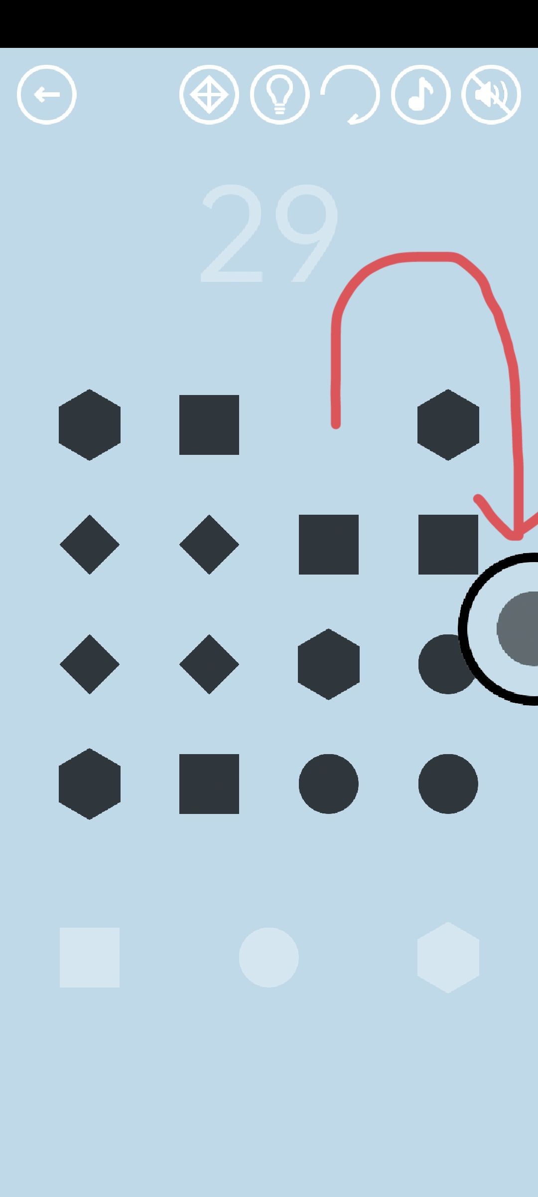 第29关:用圆圈套住相同的4个图形,拖着它们放在下方相应轮廓上,该轮廓会变橙色。让三个轮廓都变成橙色,依次点击即可过关。如果总是不小心套到其他图形,可以参考下图中的例子:仔细观察,4个圆形分布比较集中,而且离边框都比较近,我们就从圆形入手,先套住第一行的那个圆形,从右边绕下去,很容易就能集齐4个圆形同时避免其他图形乱入。