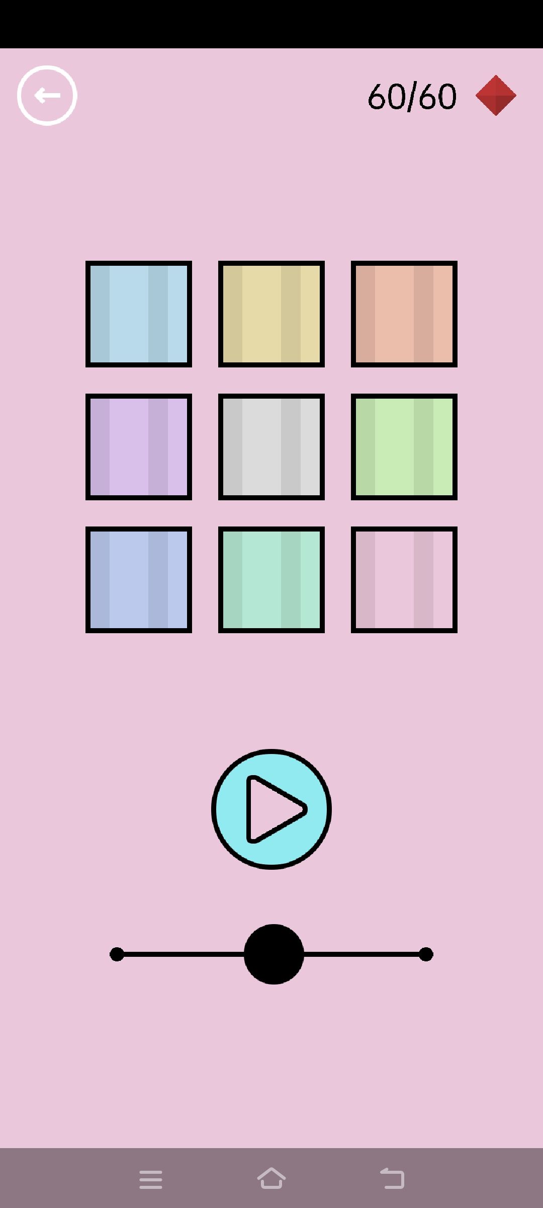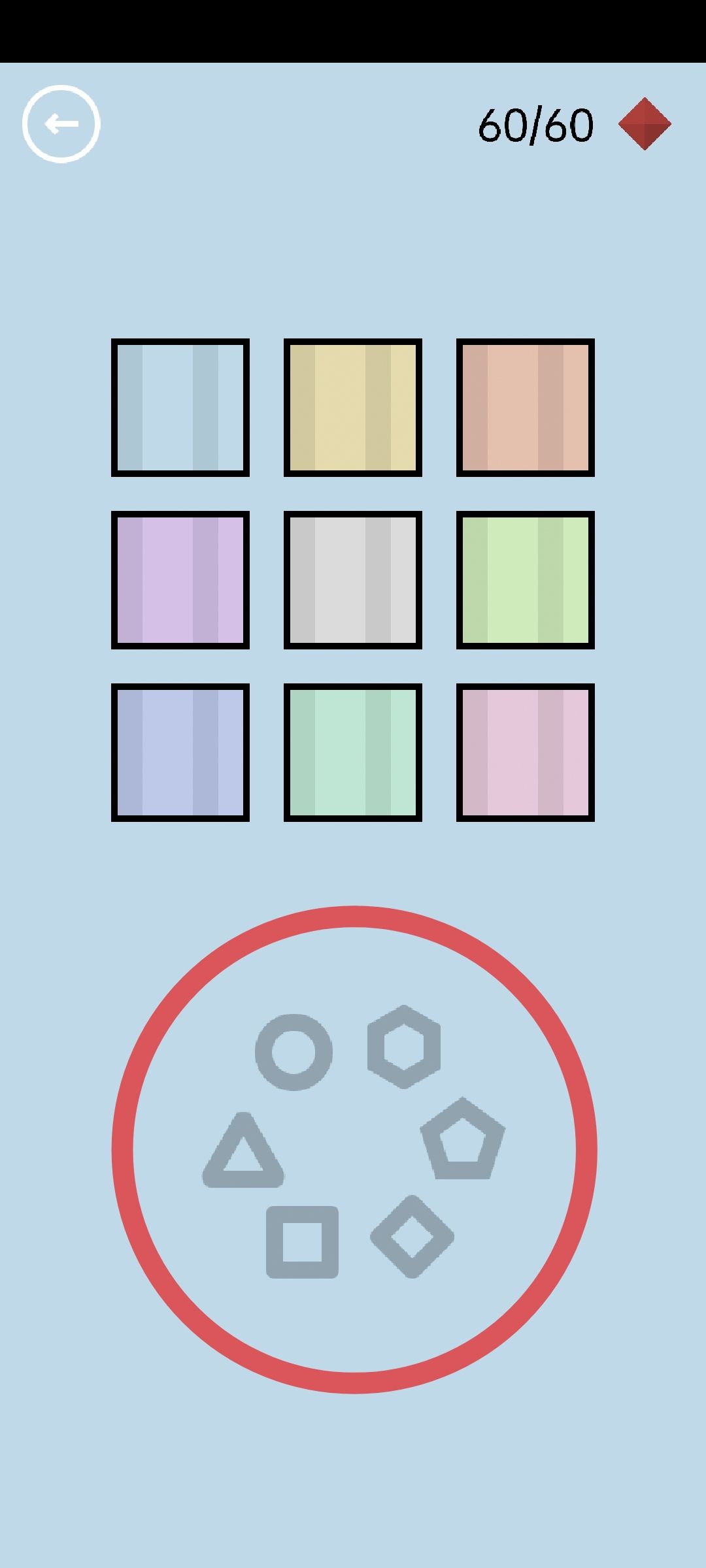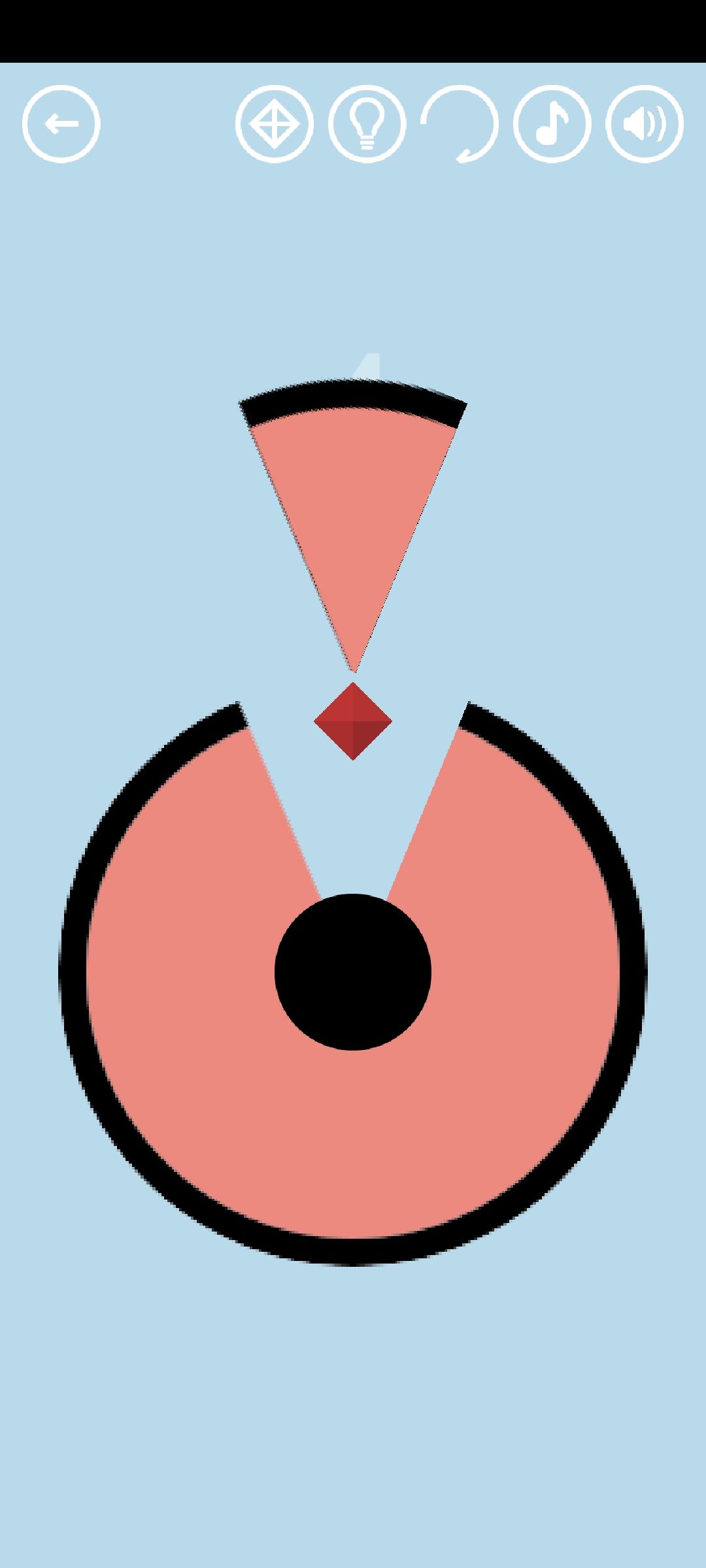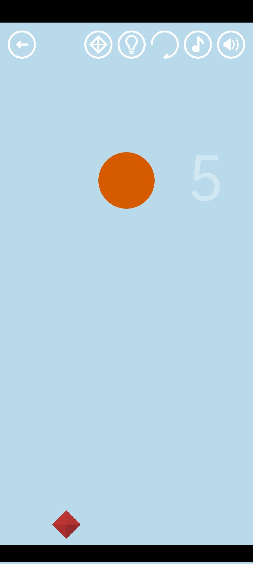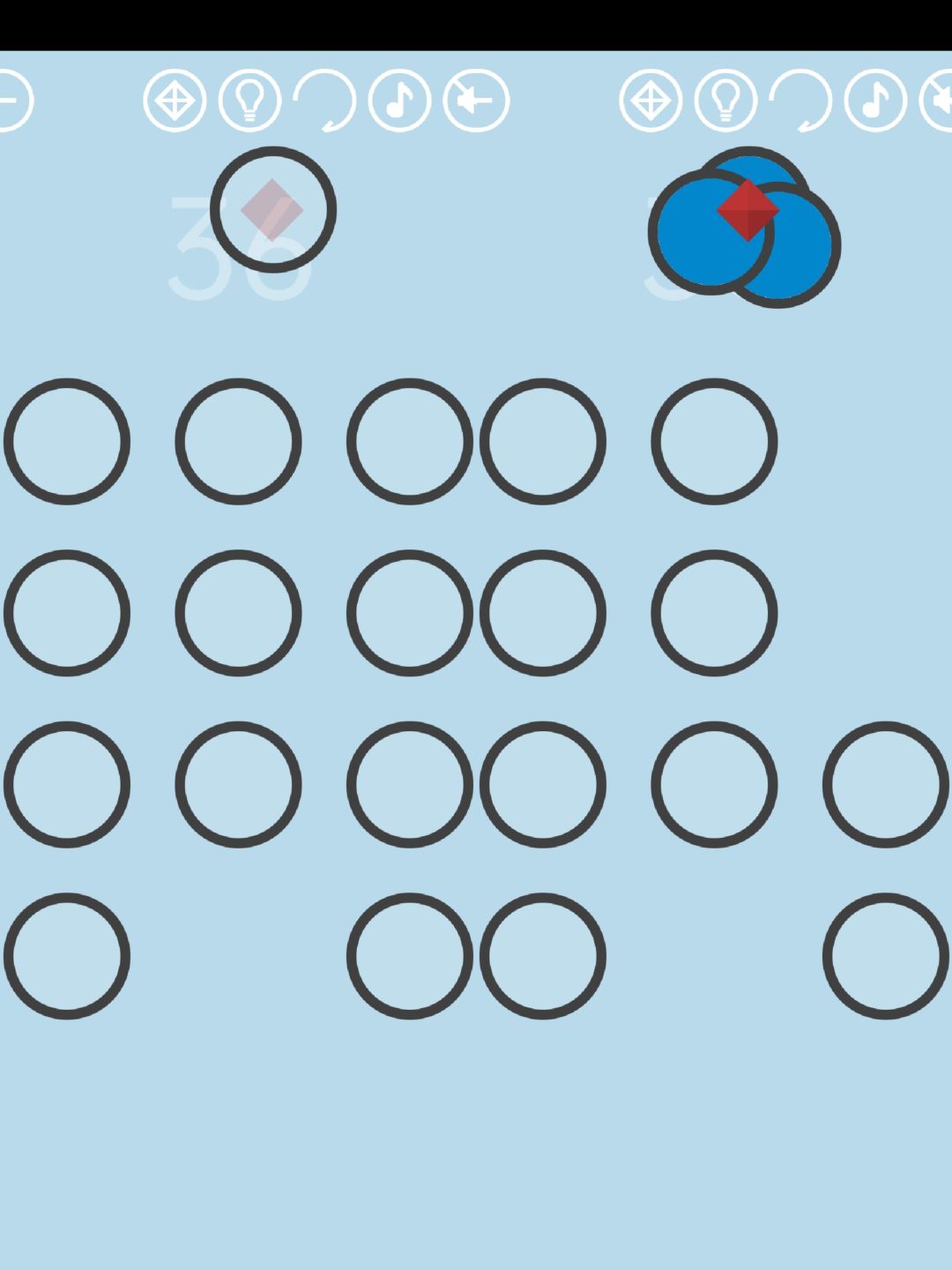 第36关:3个圆圈叠起来会变成蓝色。将12个圆圈均分成4份每份3个,分别叠起来,即可得到通关按钮。红宝石随机出现在顶部或底部的空白处。拿着一个圆圈寻找,发现淡红色的菱形时,叠3个圆圈在菱形上,得到红宝石。