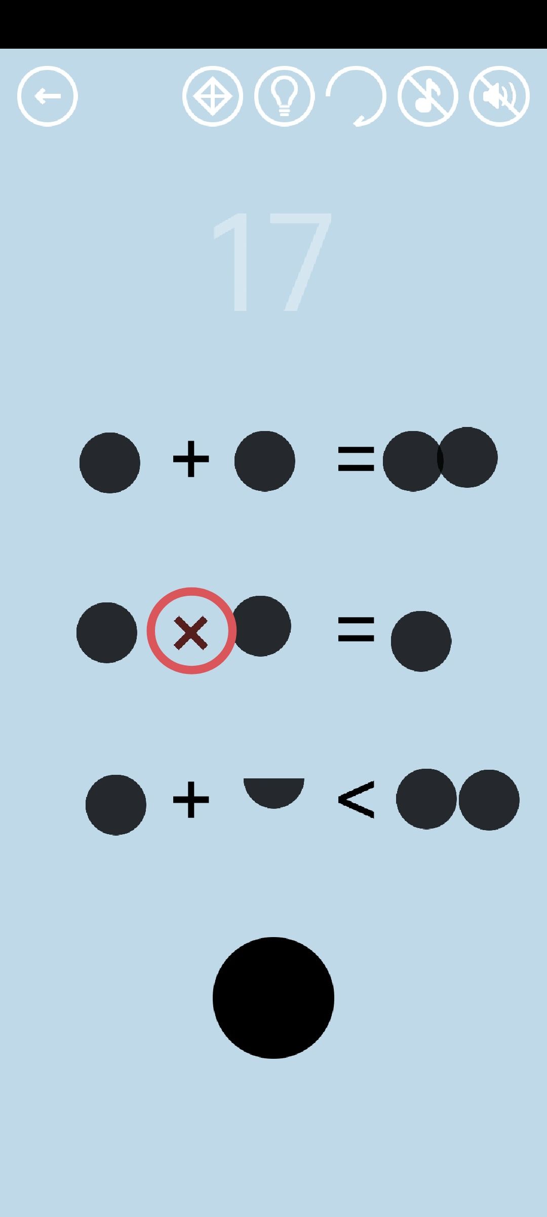 第17关:将圆形看作数字1,移动圆形和半圆使等式和不等式成立得到通关按钮,答案如图所示。点击红圈处暗红色的乘号得到红宝石。