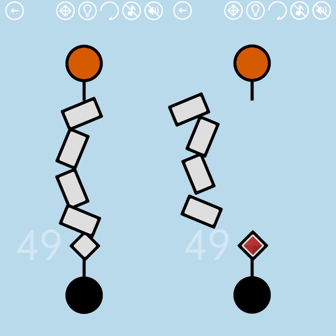 第49关:将白色菱形和长方形摆成一列,使黑色按钮与白色按钮连接,点击黑色按钮,白色按钮变成橙色,点击即可通关。单独连接黑色按钮与白色菱形,点击黑色按钮得到红宝石。