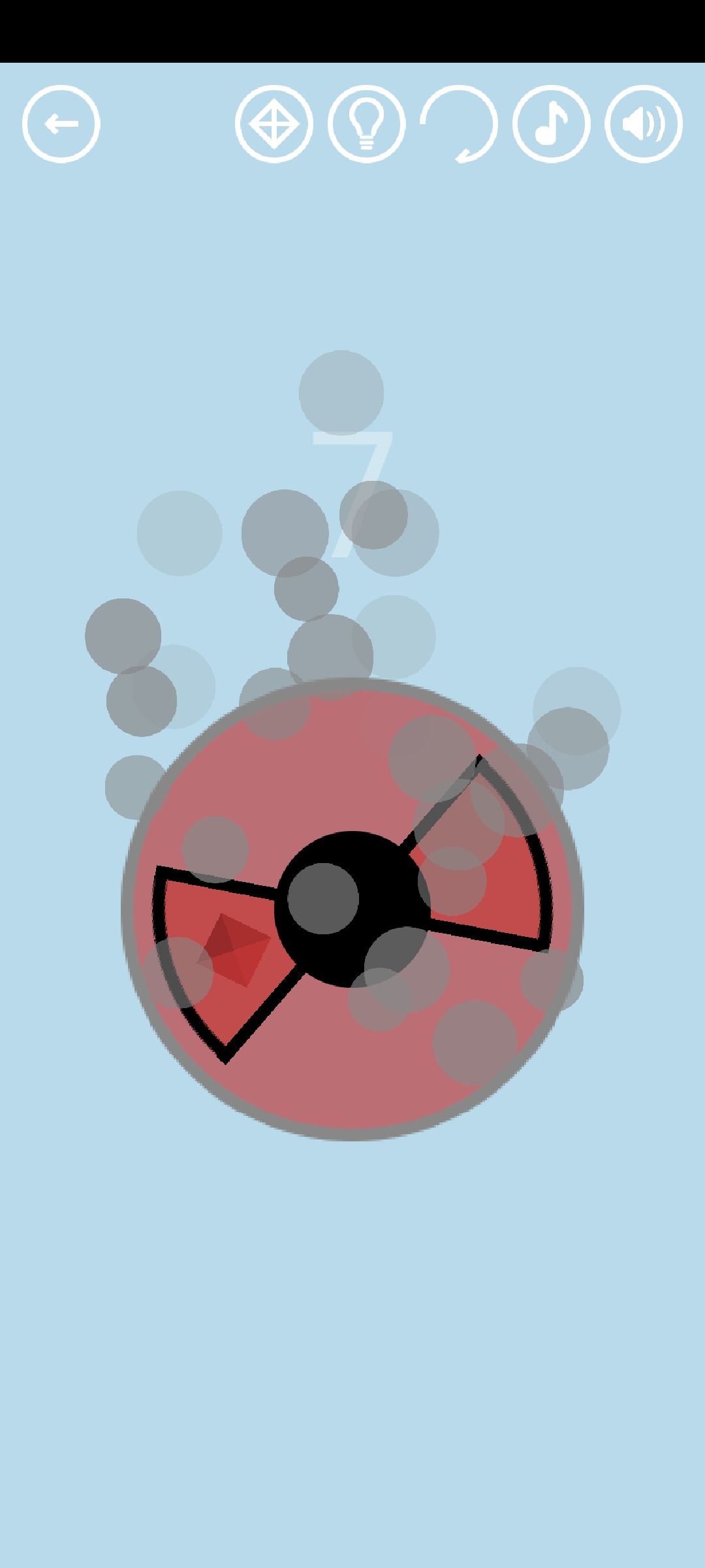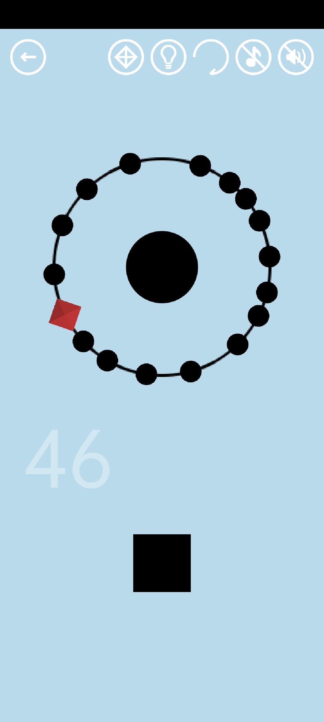 第46关:点击黑方块可以发射小黑球到圆圈上,碰到之前的小黑球则游戏失败。圆圈可以被转动。发射16颗小黑球到圆圈上得到通关按钮。第17颗“子弹”是红宝石,发射到圆圈上即可获得(也不能碰到之前的小黑球哦)。