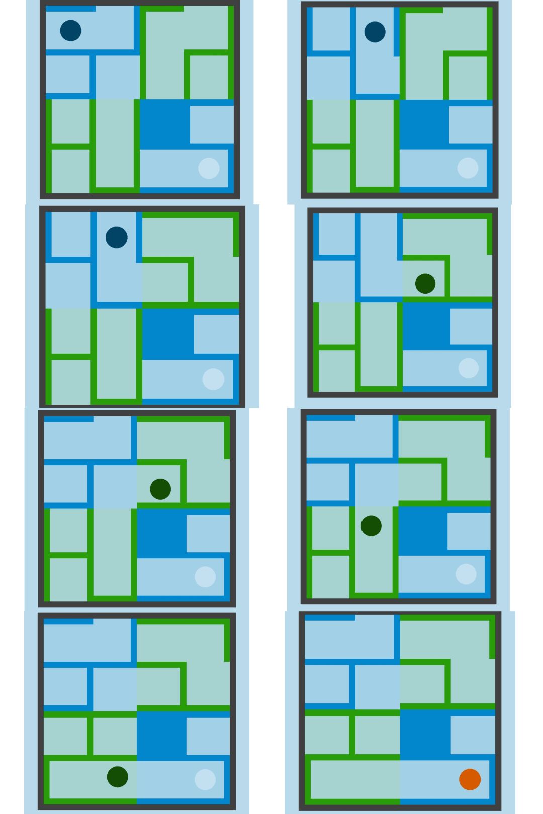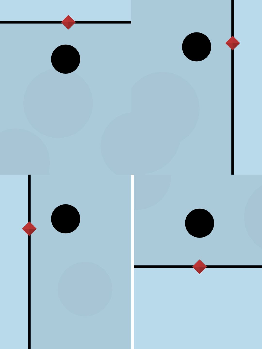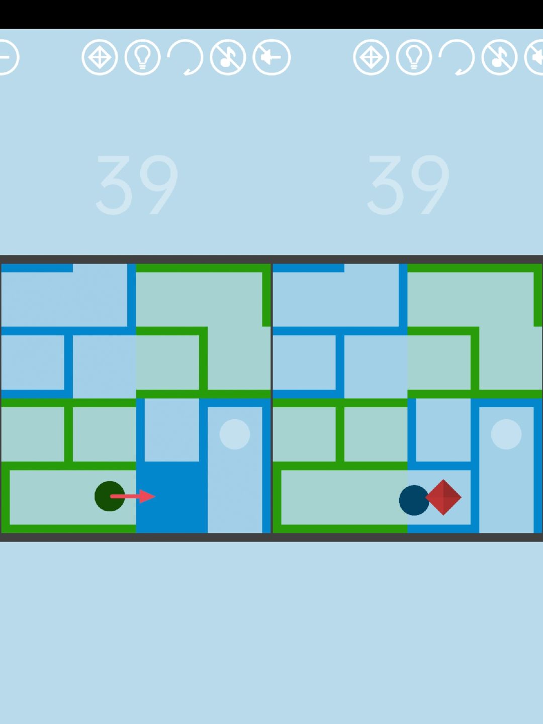第39关:目标是将黑球移动到白色轮廓处。大迷宫分为四小块,点击每一小块可以使其顺时针旋转90°。一种通关步骤如图所示: