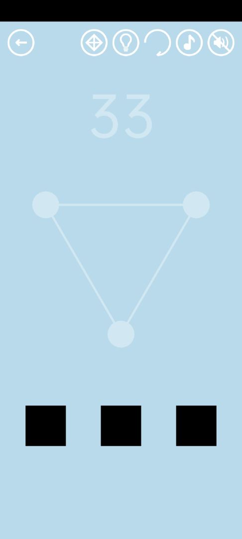 第33关:长按黑色按钮会垂直弹出黑球,弹跳的高度与按按钮的时长有关。使三个黑球同时到达白色轮廓处,通关按钮就会出现。一种成功率比较高的方法如视频所示:先长按左侧和右侧按钮,同时释放,待左侧和右侧黑球弹出后,立刻按住中间按钮,在左右黑球即将下落到白色轮廓上时将中间黑球放出去。