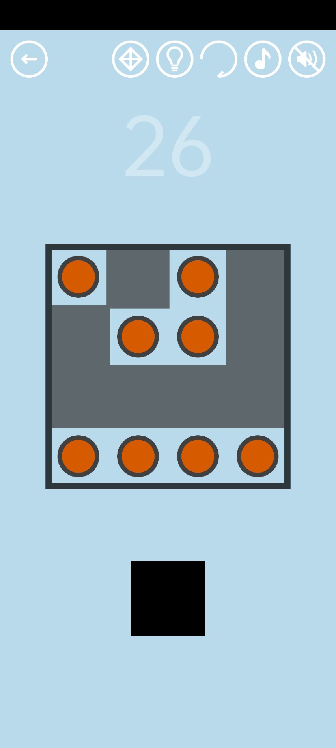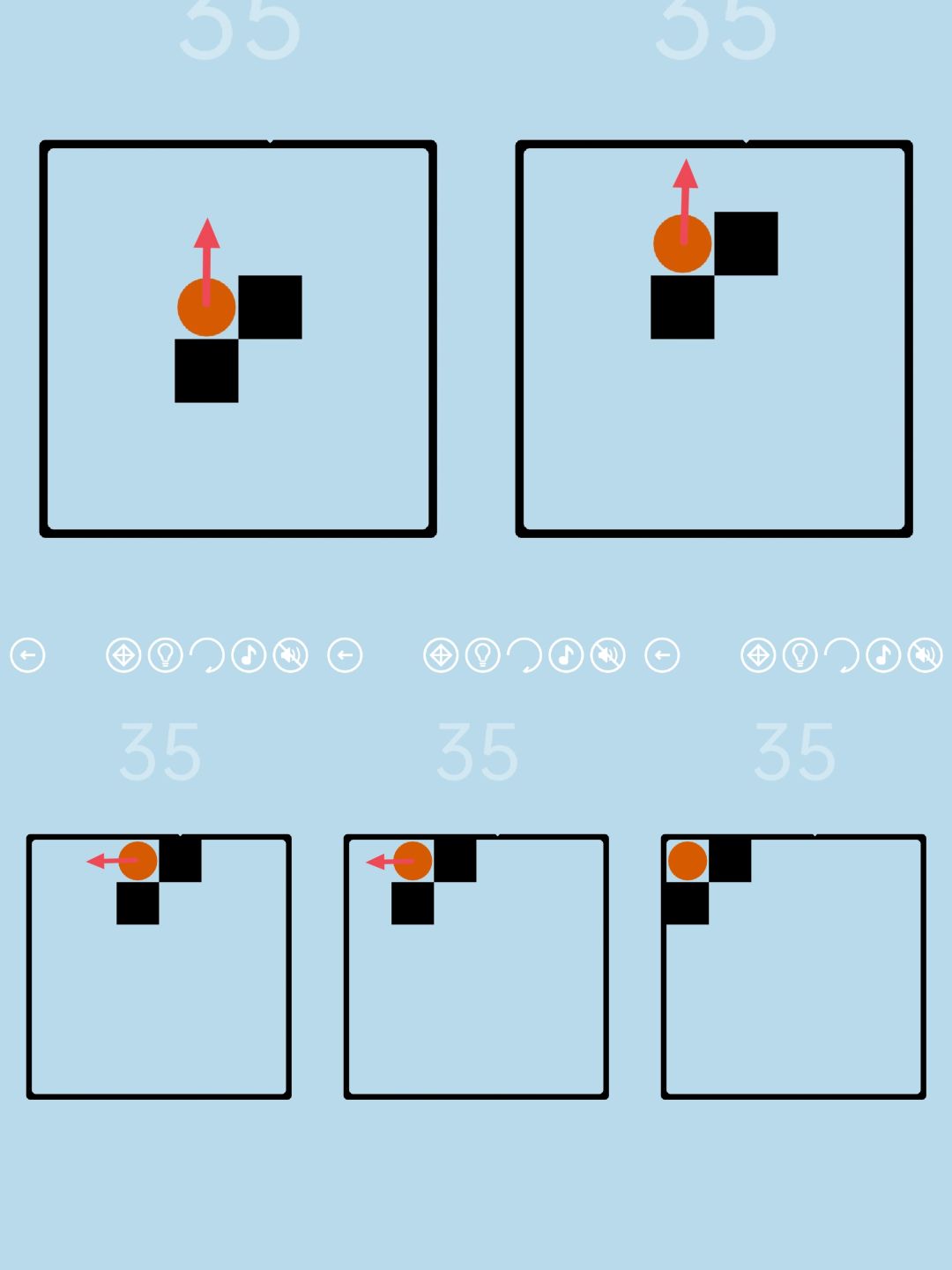 第35关:点击橙色按钮,它会往任意方向移动一格。用两个黑色方块堵它的路,一步步将它堵在角落,点击即可通关。如图所示:
