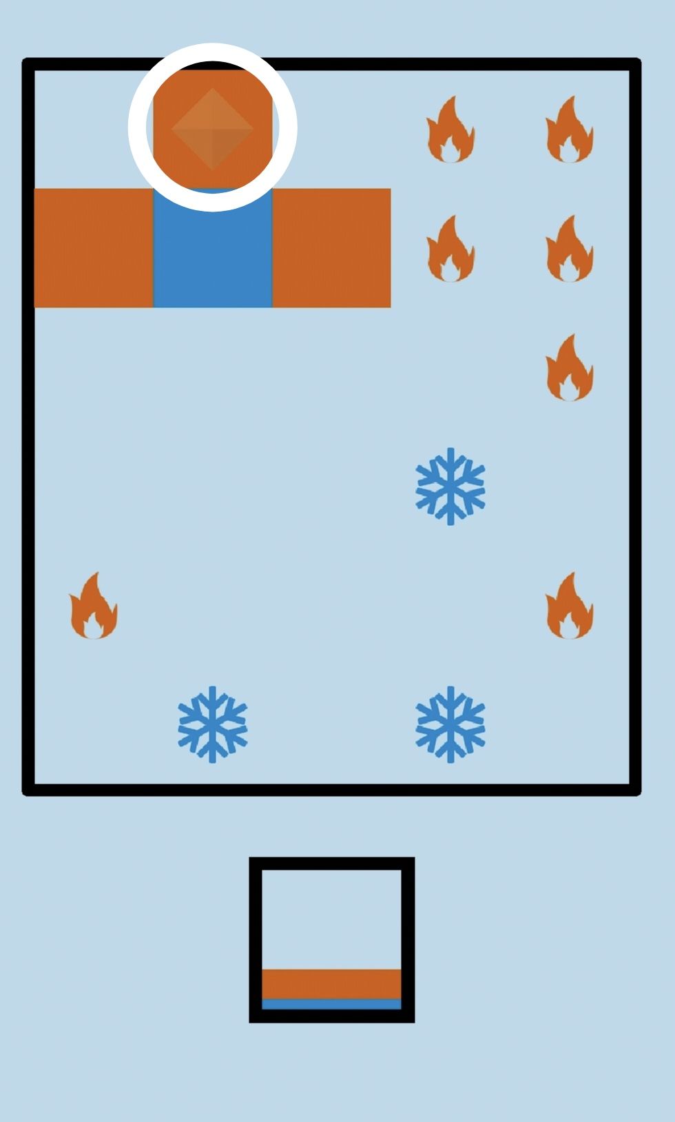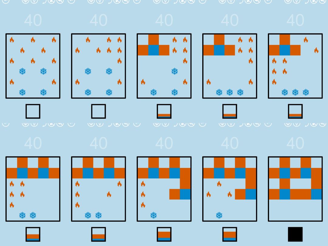 第40关:当雪花与火焰位于相邻格时,雪花会变成蓝方块,火焰会变成红方块。因此,一个雪花最多可以使三个火焰同时变成方块。游戏目标是将所有的雪花和火焰都变成方块。一种通关方式如图所示: