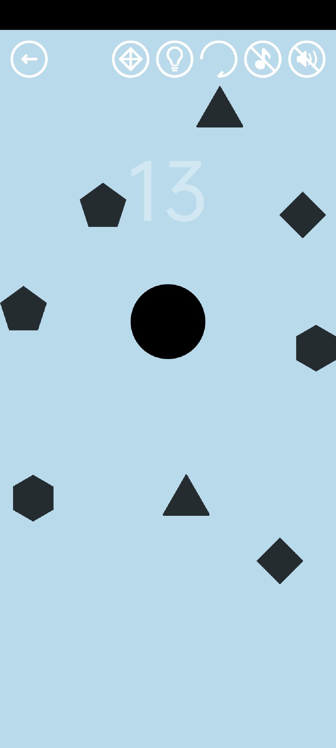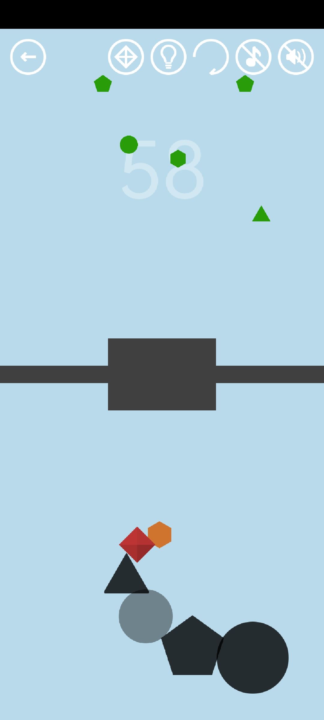 第58关:让大黑圆接触绿色小图形,这个小图形就会跟在大黑圆的后面。接触到黑色方形或者黑色长条障碍的小图形会消失;如果大黑圆直接接触障碍,那么收集到的所有小图形都会消失。黑色方形可以被移走。位于第四位(不算大黑圆)的菱形会变成红宝石。集齐三角形、菱形、五边形、六边形这四种图形时,四种图形中最后被收集的那个会变成通关按钮。