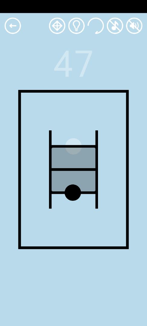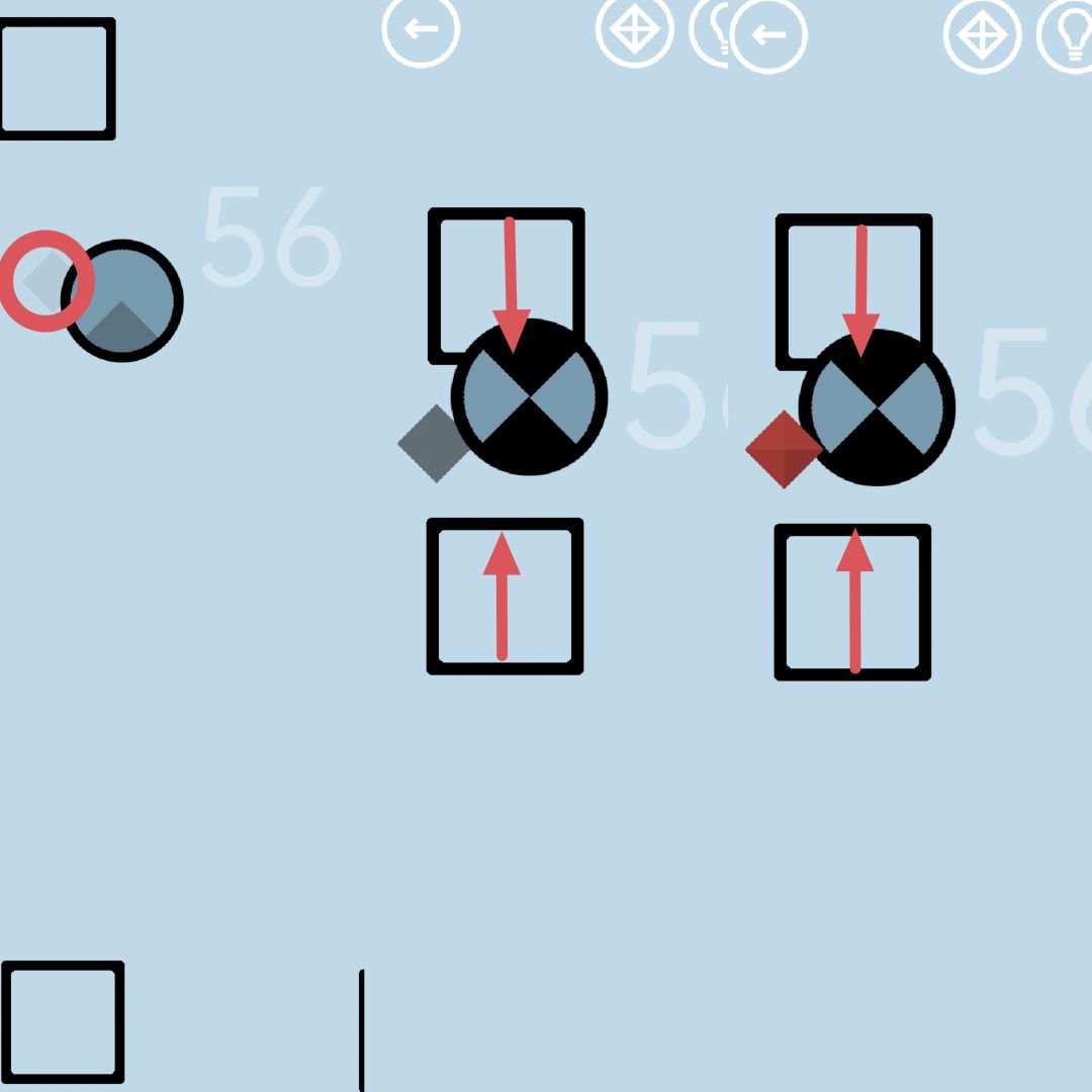 第47关:位于方框内部的物体,所受到的重力方向会改变。方框颜色最浅时重力向左,颜色较深时重力向右,变成黑色时重力向上。将黑球移动到白色轮廓处得到通关按钮。通关按钮出现的同时,在与它重合的地方出现一颗白宝石,在黑球的起点处出现宝石的轮廓。白宝石和它的轮廓都只能在黑色方框中看到。将白宝石移动到轮廓处得到红宝石。全程视频如下: