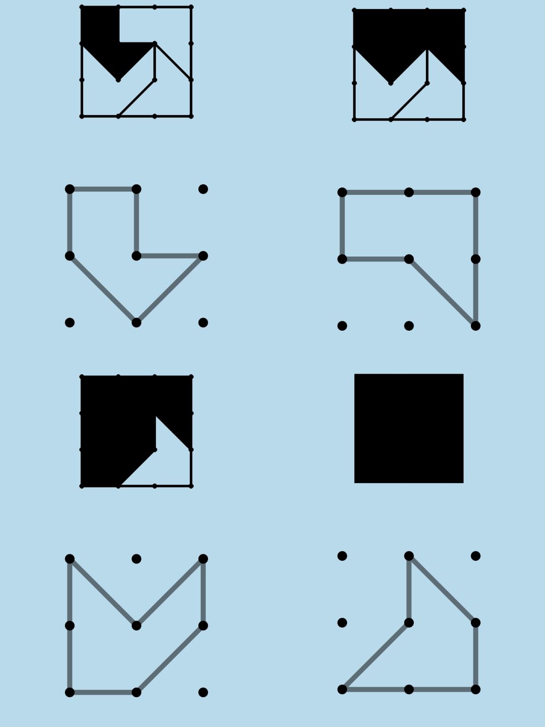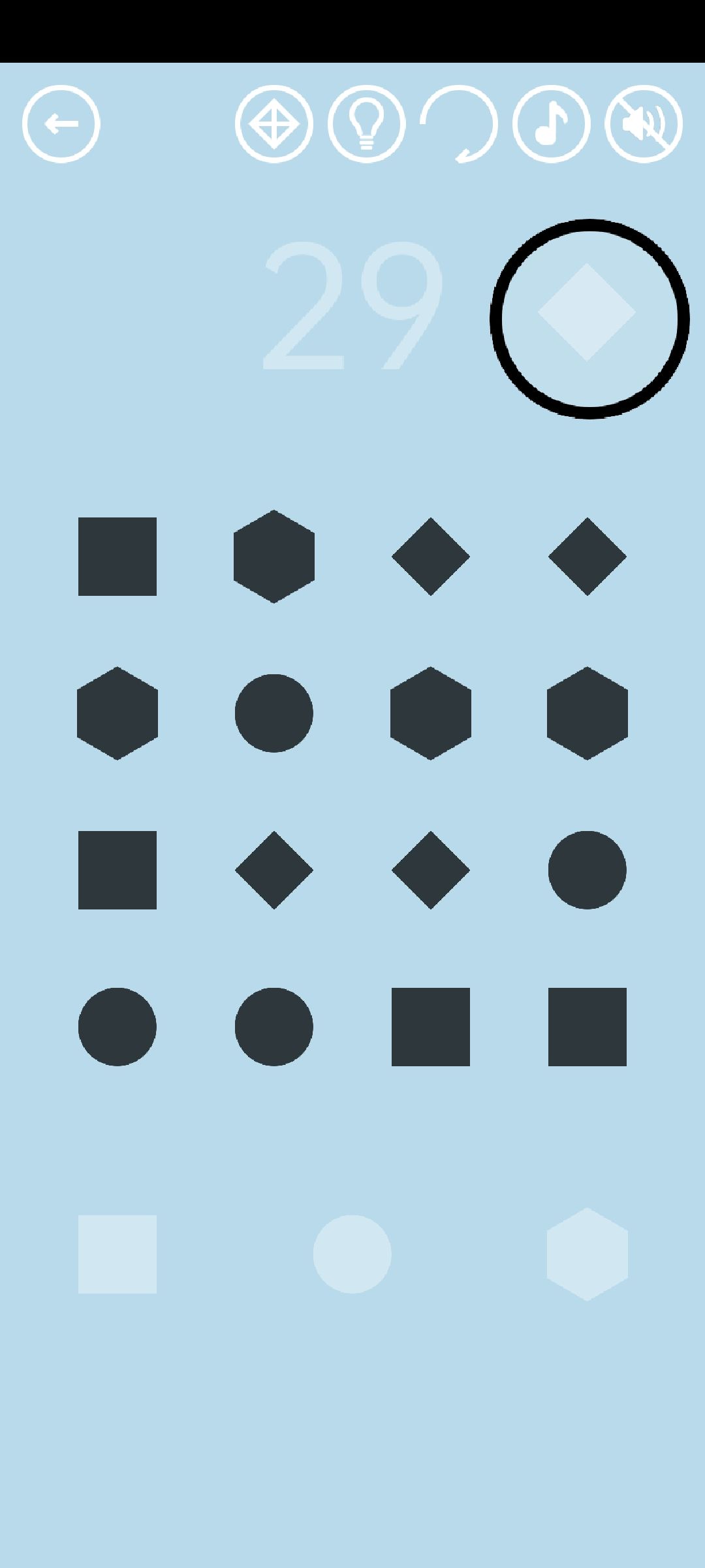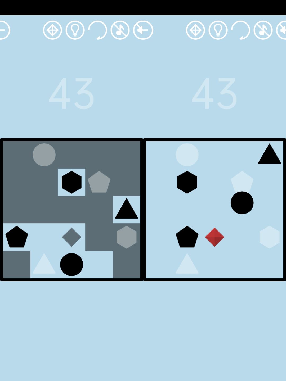 第43关:除了四个黑色图案之外,所有格子都盖着一层膜,点击或滑动可以把膜“刮掉”。把黑色图案周围格子的膜刮掉,可以给图案创造一个活动的空间——它会在空白区域随机移动。玩家的目标是把四个黑色图案都移动到相应的灰色轮廓上去。为了避免不同图案移动时互相影响,建议每次只刮掉一两格,让它们“各自走、小步走”。这关虽然每次打开都会变,但是黑色图案和它对应的灰色轮廓总是近似于斜对角相对的,因此一种简单过法是把四个图案一起沿边框移动到斜对角,然后你就会发现图案和轮廓已经很接近了。如图所示(为了演示思路,圆形和六边形都走过头了,明白意思即可):