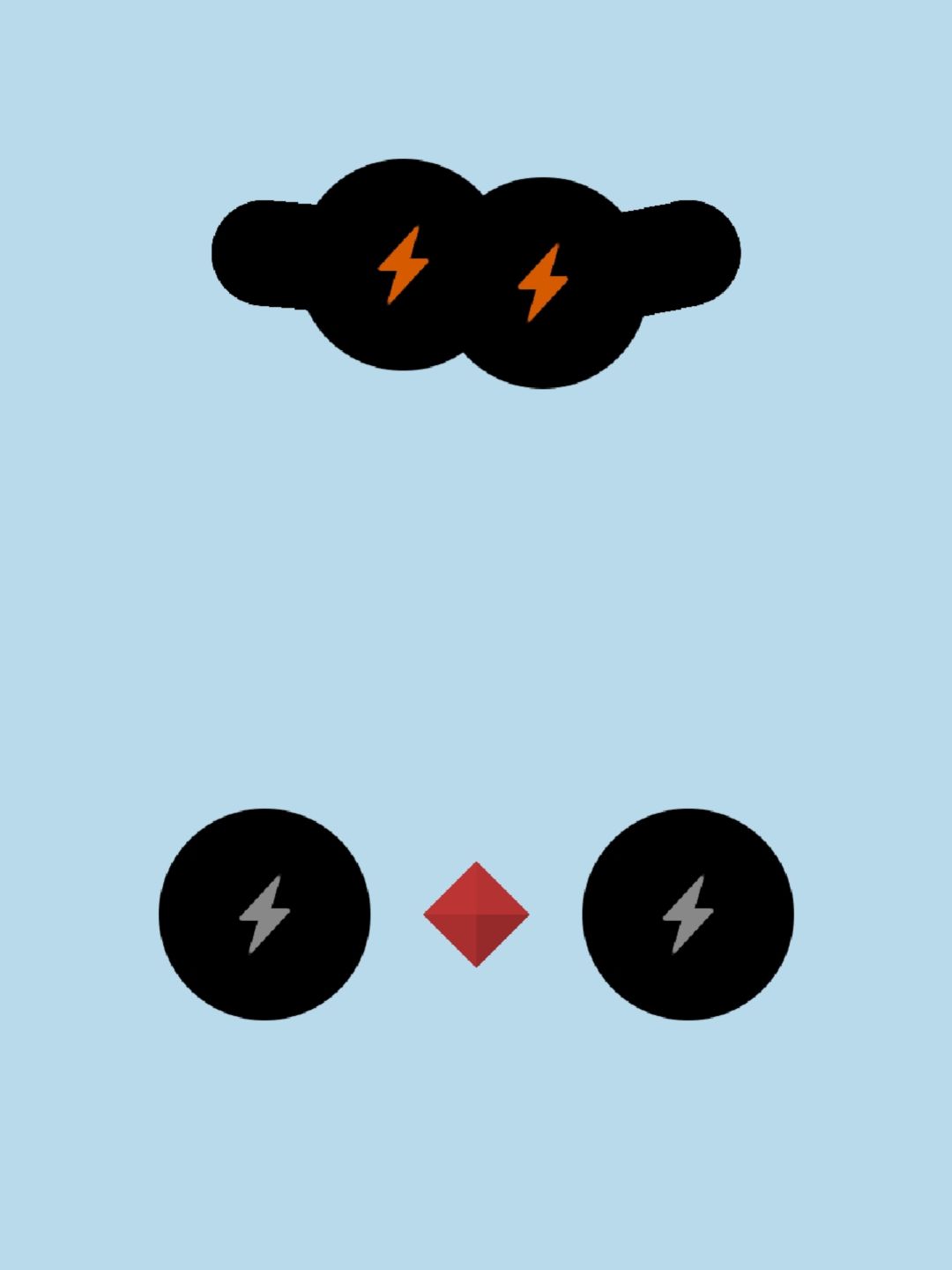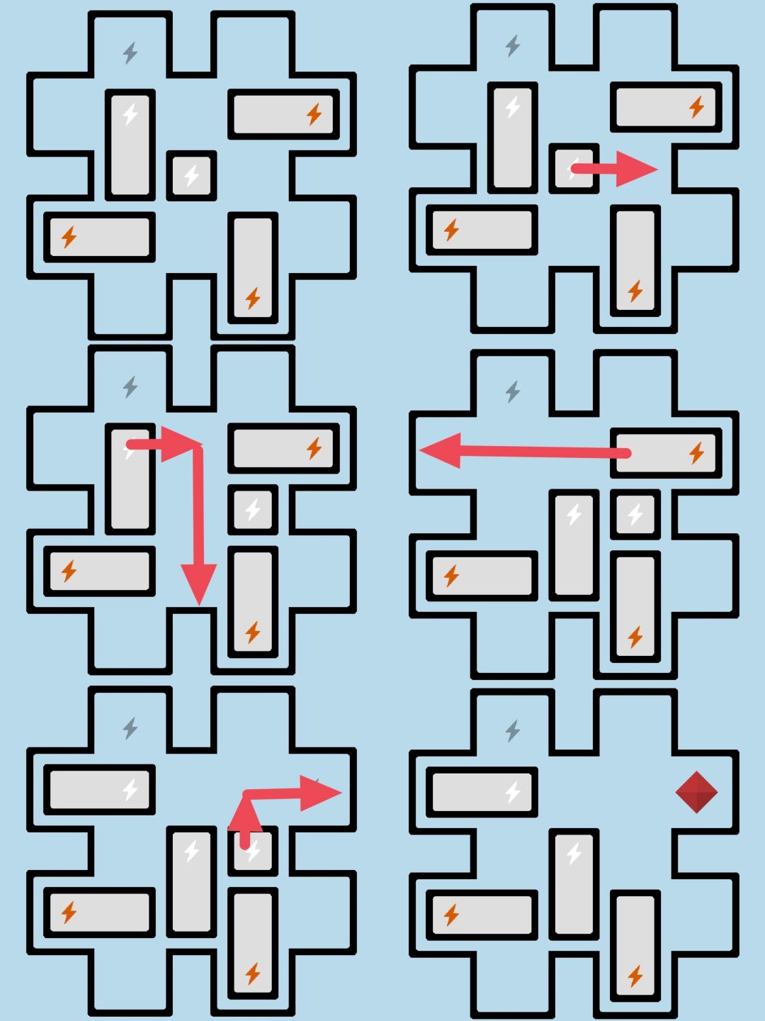 橙色按钮出现后,移开任意一块电池,橙色会消失,出现一块正方形小电池。将正方形小电池移动到任意一个闪电形状处得到红宝石。图为一种移动方式。