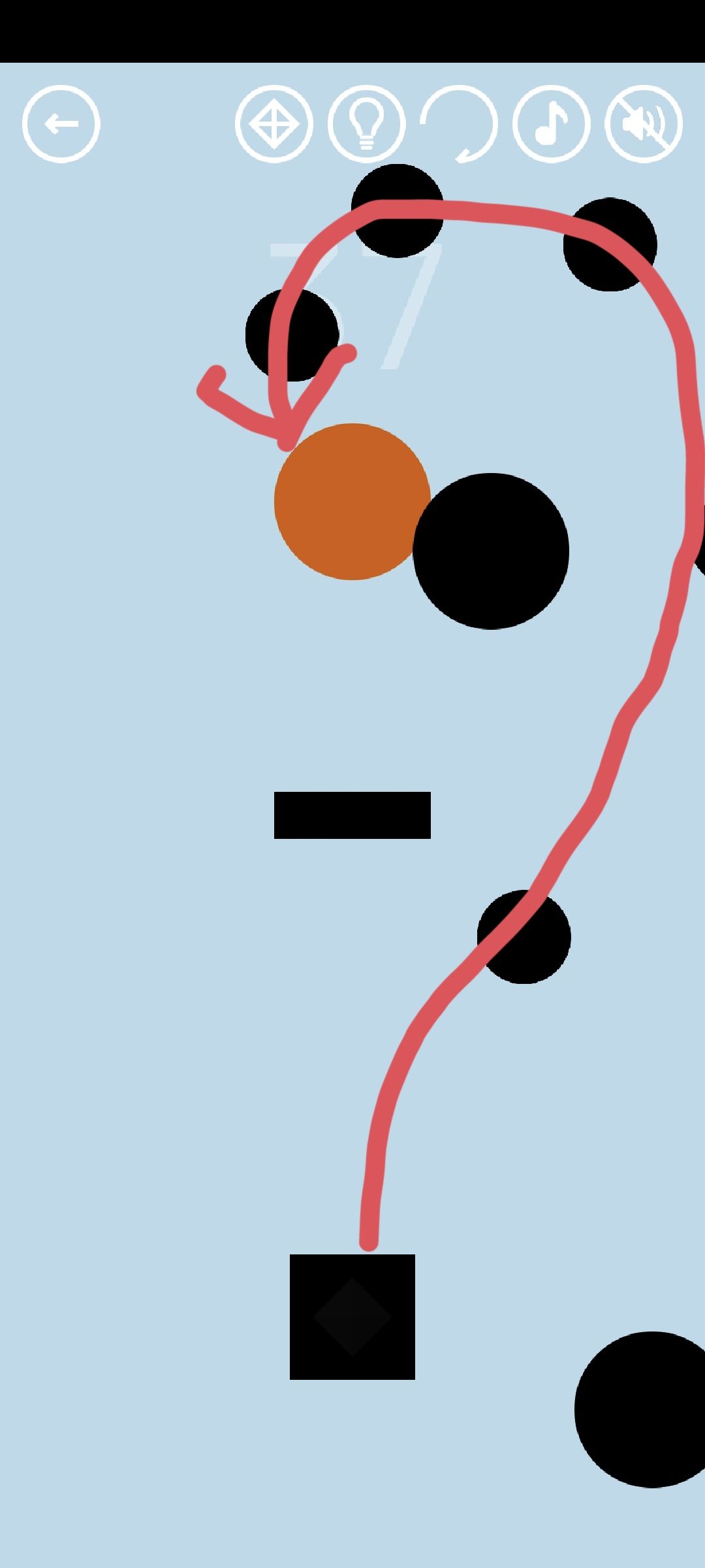第37关:点击黑色方块发出小黑球,小黑球会被大黑球吸引而改变轨迹。移动大黑球,使小黑球连续打到空白圆圈即可得到通关按钮。图示为一种神奇的“?”形轨迹: