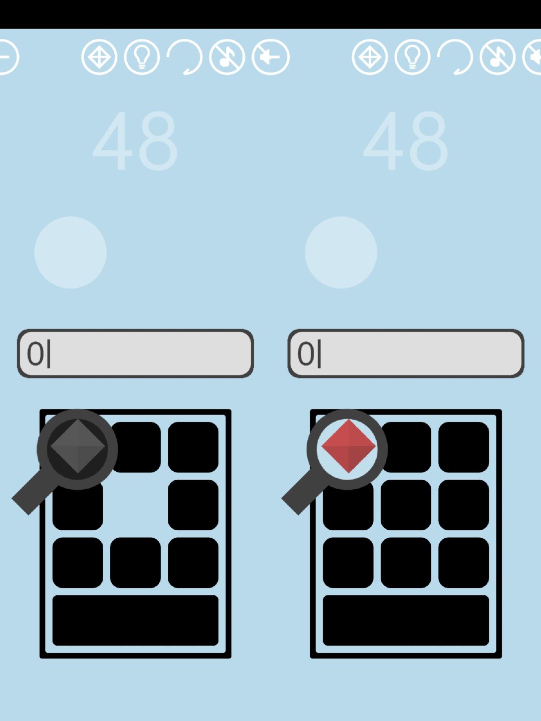第48关:输入数字,点击放大镜,会生成一个黑球,黑球的大小与数字的大小成正比。生成和白色轮廓一样大的黑球并放在轮廓上即可得到通关按钮。键盘上没有数字5,但是可以把其他按键拖到中间充当数字5。红宝石藏在其中一个按键之下,用放大镜观察可以看到宝石的轮廓。把这个按键移走,再次用放大镜观察,得到红宝石。