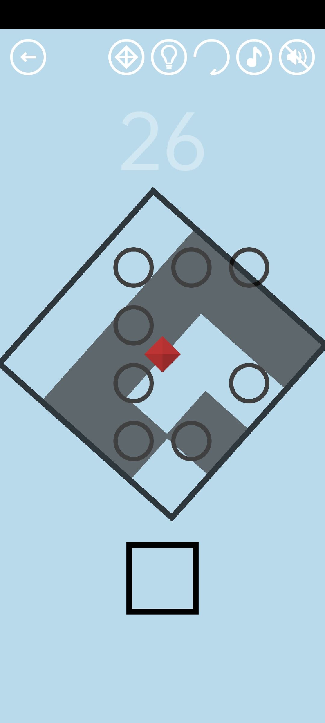 第26关:灰黑色区域的球不能移动,白色区域的球可以移动。转动大方框、移动球,使所有球都在白色区域,得到通关按钮(这一关每次都不一样,没有通用步骤)。将大方框转45°呈现◇形,保持几秒钟,得到红宝石。