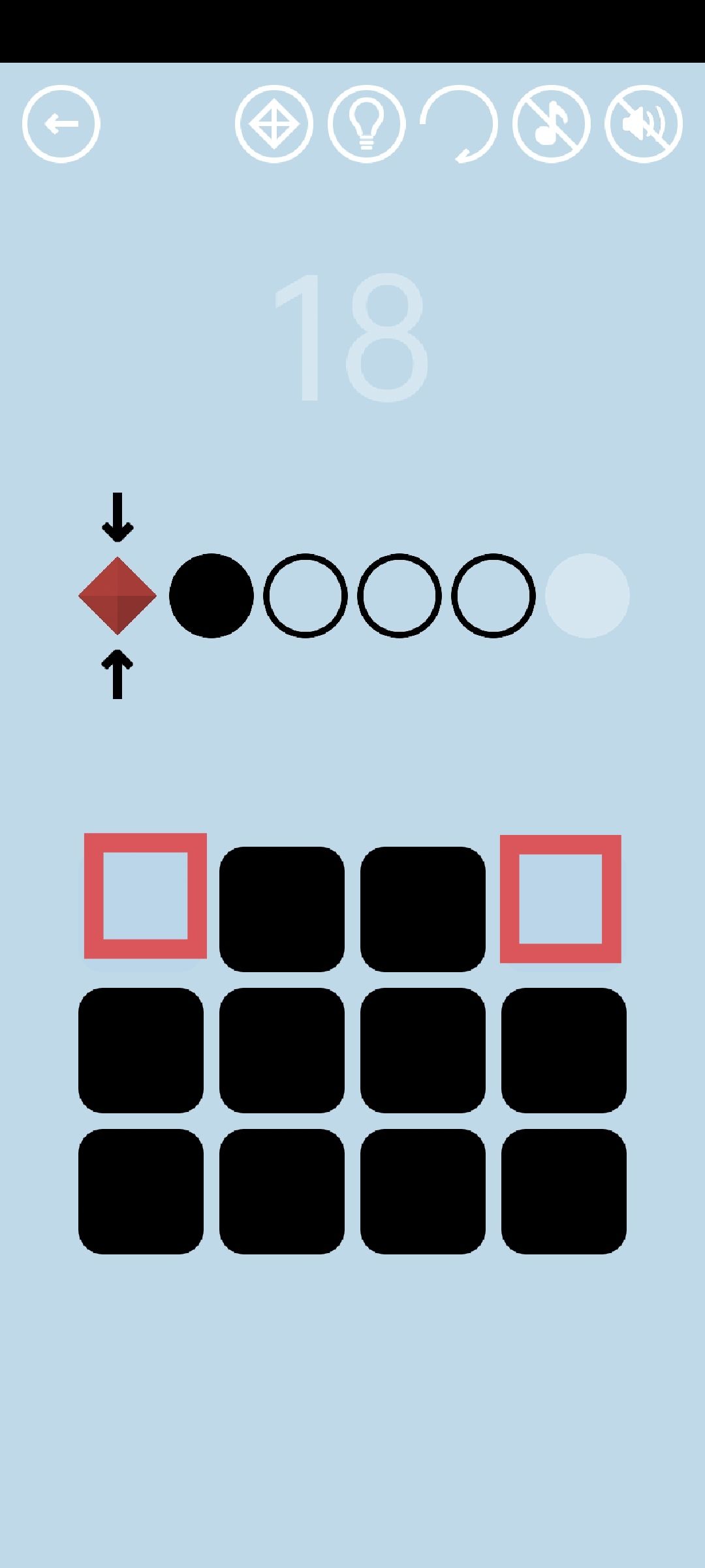 第18关:依次点击每个按钮,看箭头各自指向哪个圆。当与黑圆相邻的白圆同时被两个箭头指着的时候,被指着的白圆会变黑,而原来的黑圆变白。按此原理可将第二、三、四个圆依次变色,最终将第五个圆变成橙色通关按钮。第一个圆是黑色时,同时按住左上和右上两个隐形按钮得到红宝石。